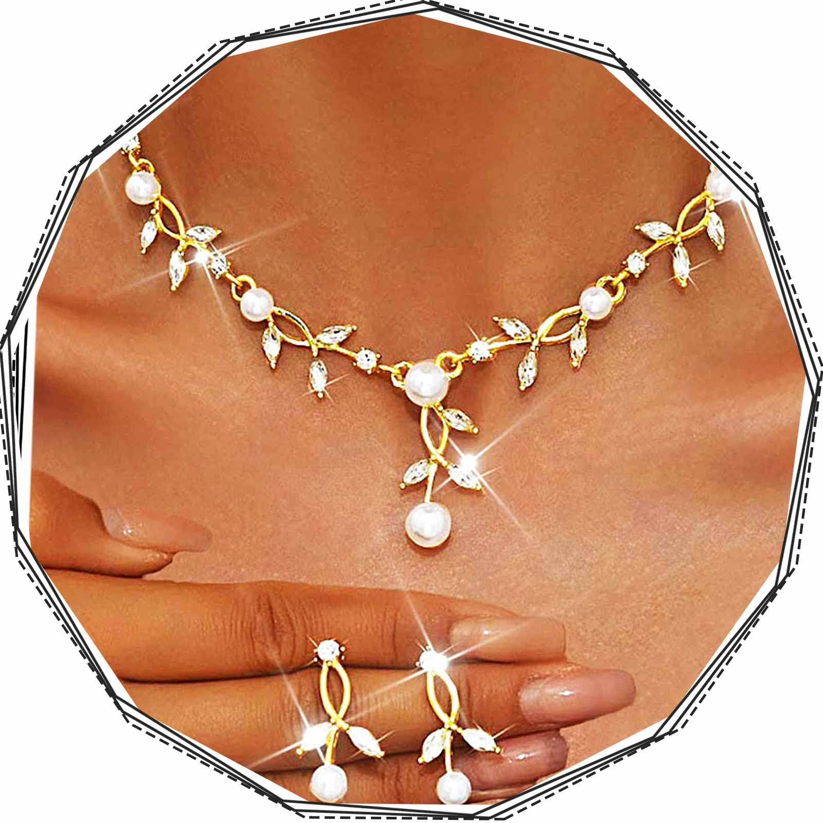 Brishow Wedding Jewelry Sets Gold Leaf Rhinestone Necklace Set Formal Pearl Costume Jewerly for Women and Brides
