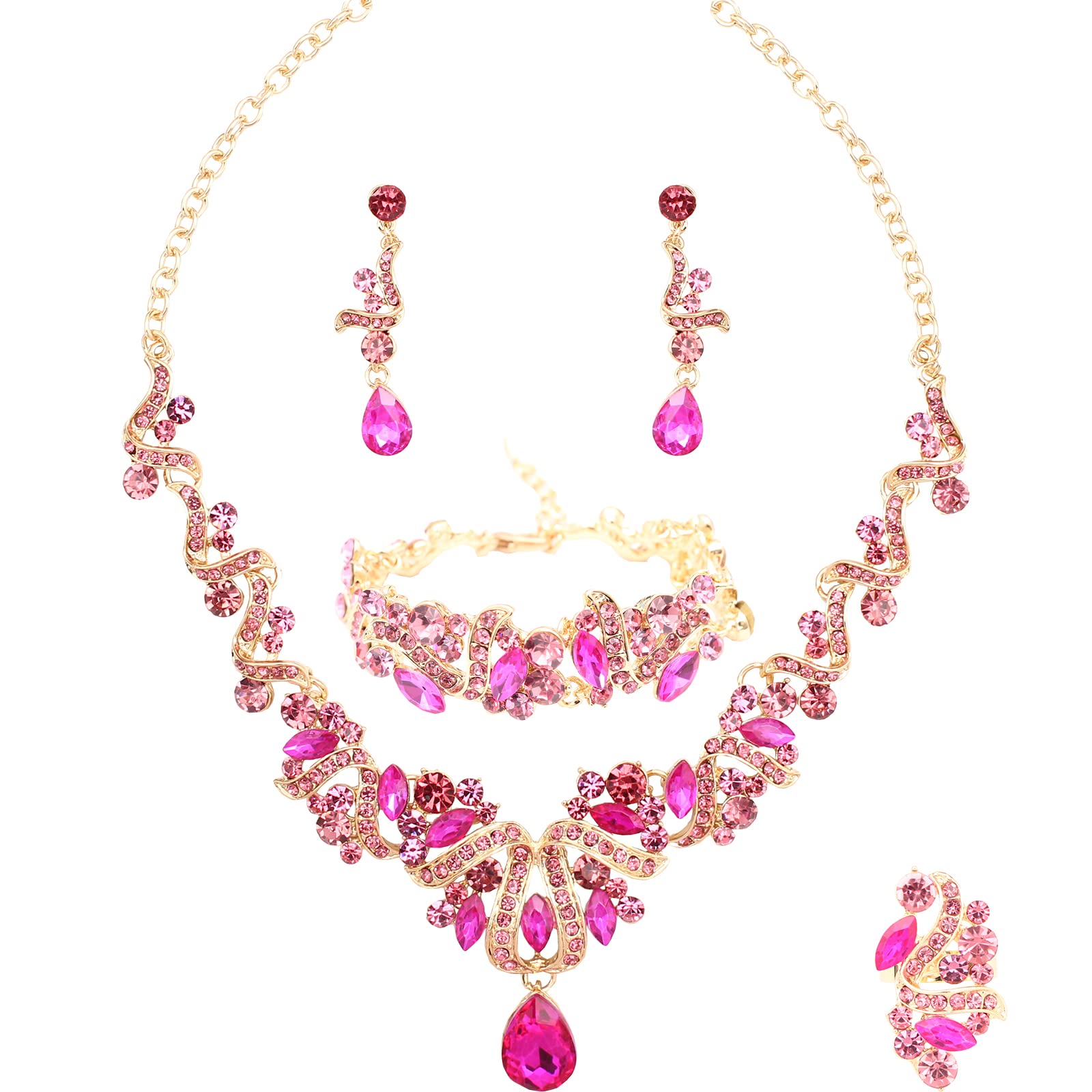 QYJ Jewelry Set for Women, Statement Necklace Dangle Earrings Bracelet Ring, White/KC Gold Plated Jewelry Set with Rhinestone Pearl Crystal Wedding