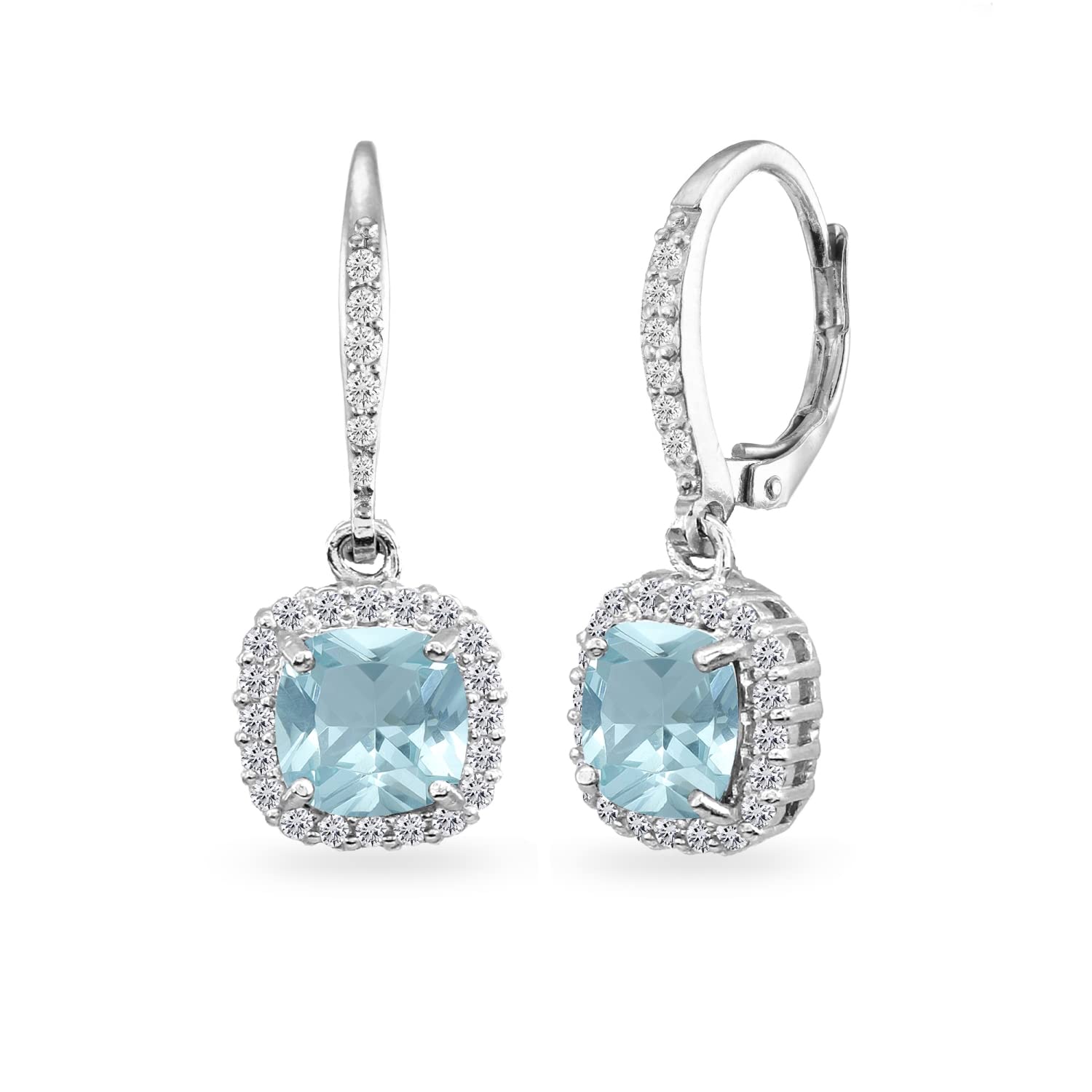 Aquamarine Earrings - These stunning earrings for women feature 7mm cushion-cut simulated green aquamarine gemstones surrounded by a of halo white topaz stones. Dangle Earrings - The earrings are crafted of fine 925 sterling silver. They secure with leverback closures. These earrings in fine jewelry
