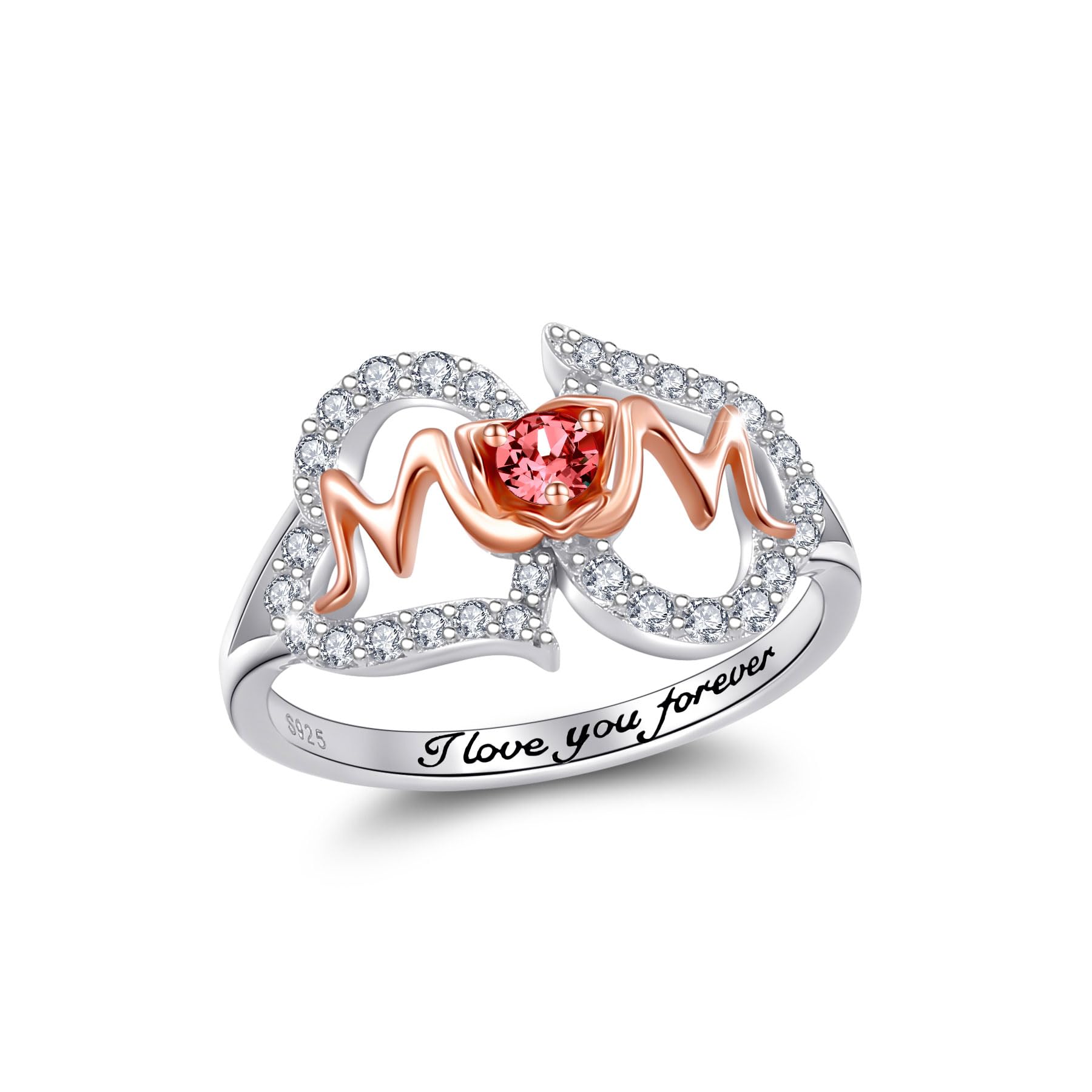 Mom& Heart Design: Our mothers ring is a stunning blend of the letters “MOM”seamlessly intertwined with a dazzling red birthstone, embodying the grace and love that mothers radiate. The heartfelt engraving “I Love You Forever”serves as a timeless reminder of the unbreakable bond and everlast