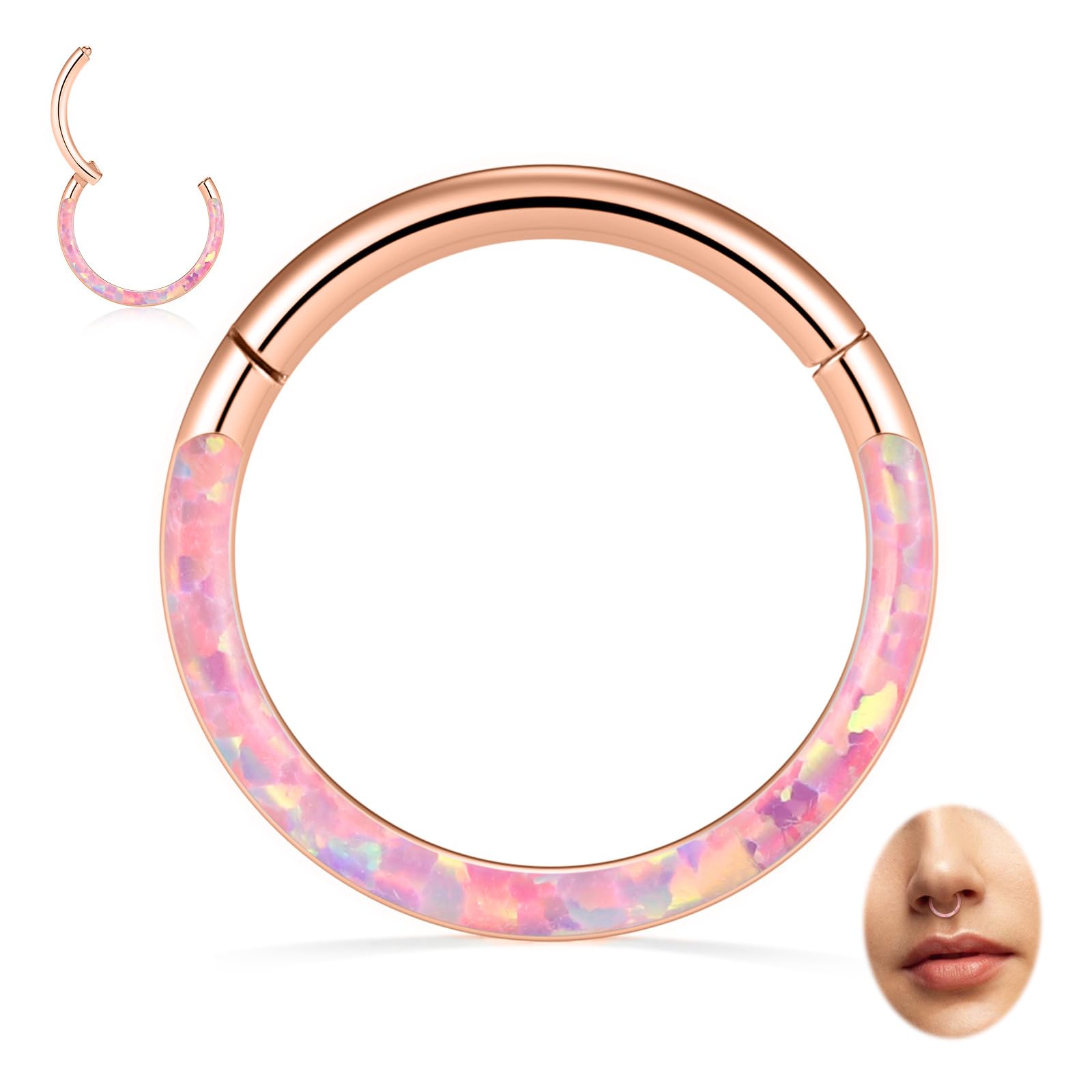 Opal Septum Jewelry Design: the front of the septum hoop is inlaid with opal to make it more fashion and charming on your ear or nose; Package include 1pc opal septum ring and come with a black velvet bag; it's suitable wear on festival, holiday and vacation Septum Ring Size: thickness: 16 G(1.2 mm)