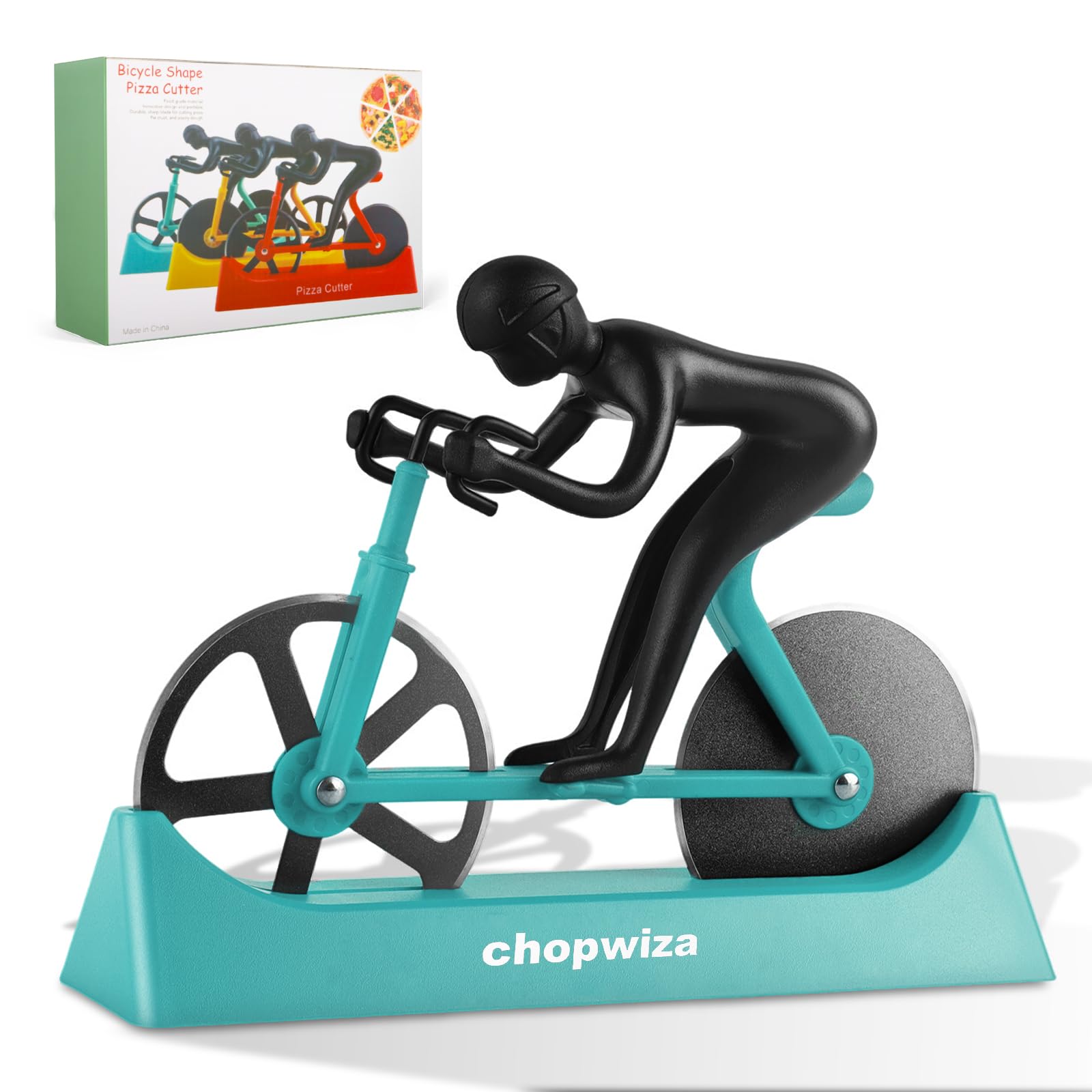 Sharp and Effortless - High-quality dual stainless steel pizza cutter wheels make cutting pizzas, sandwiches, and small breads easy and efficient. Perfect Present - With its bike-shaped design in vibrant red, yellow, and blue, this funny kitchen gadget is practical, stylish, and the perfect gift for