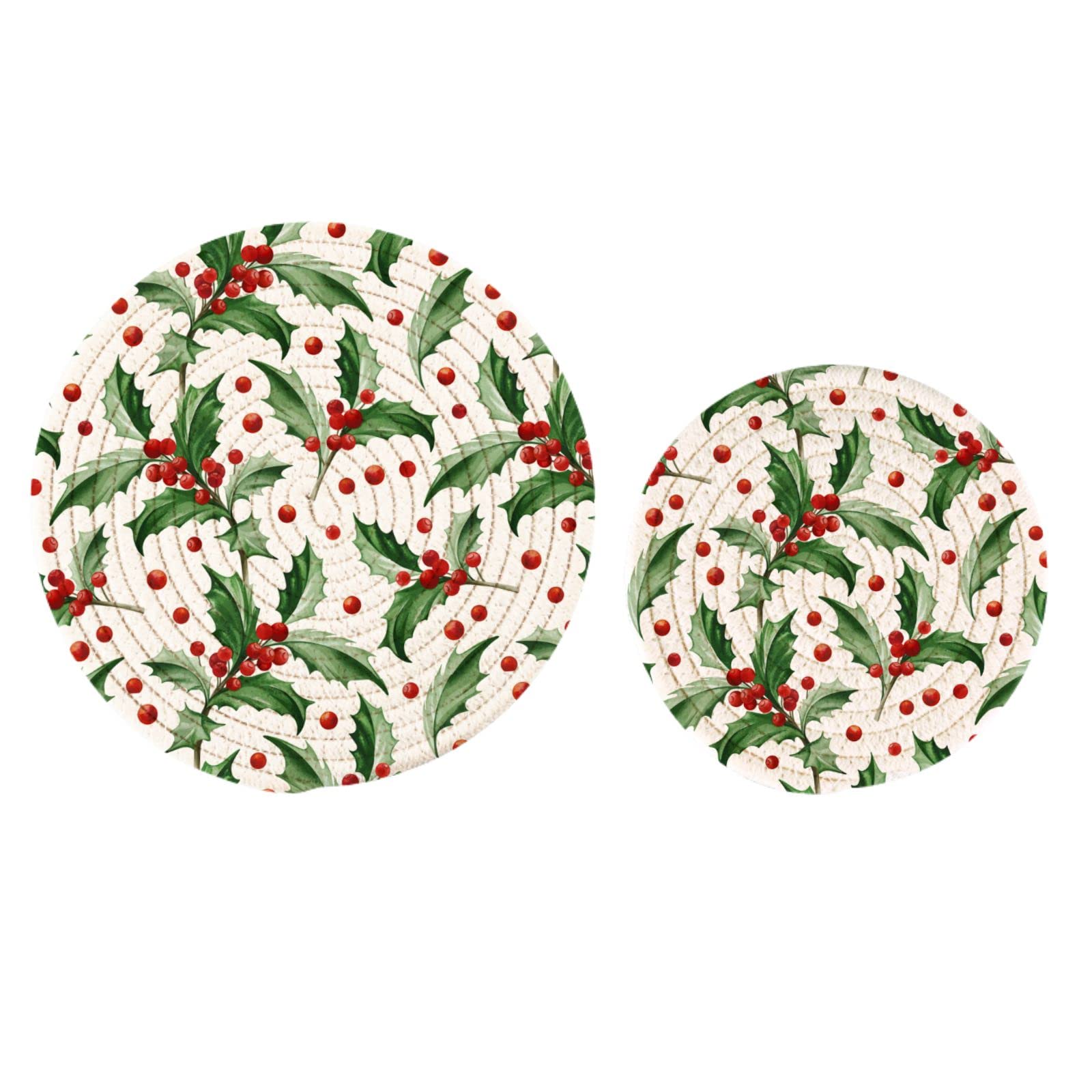 Naanle Christmas Holly Leaves Red Berry Pattern 2 Pcs Round Woven Pot Holders Trivets Set, 100% Cotton Coasters Placemats for Cooking Baking Hot Dish