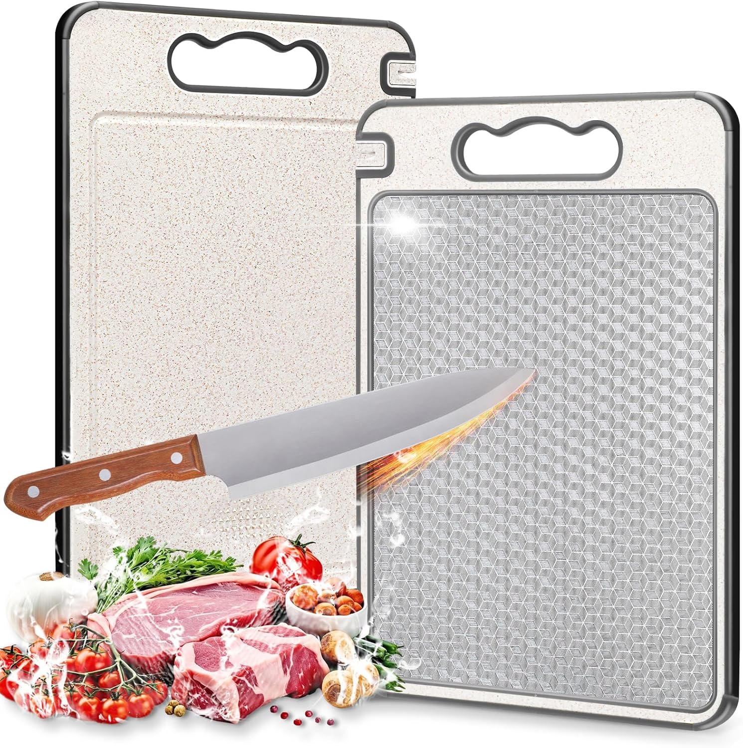 Double-sided cutting board, food-grade 304 stainless steel and wheat straw for meat and vegetables, sturdy and durable, scratch-resistant mesh design,
