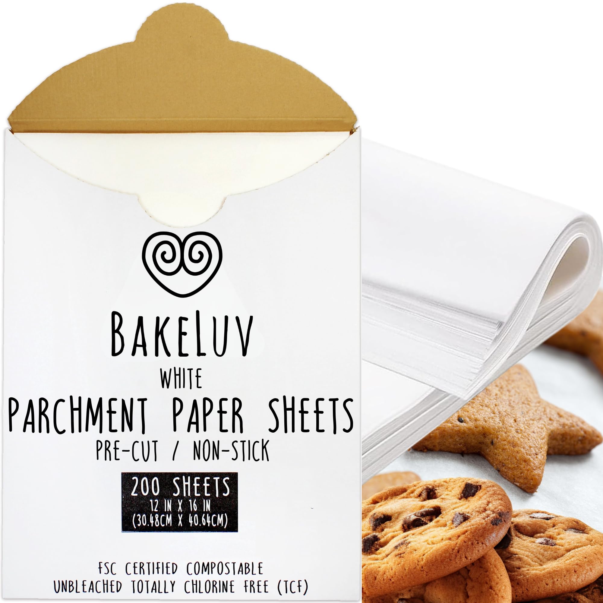 BAKELUV White Parchment Paper Sheets 12x16” | 200 Pcs | Non-Stick Precut Parchment Paper for Baking Sheets, Baking Paper, Unbleached Cookie Sheets,