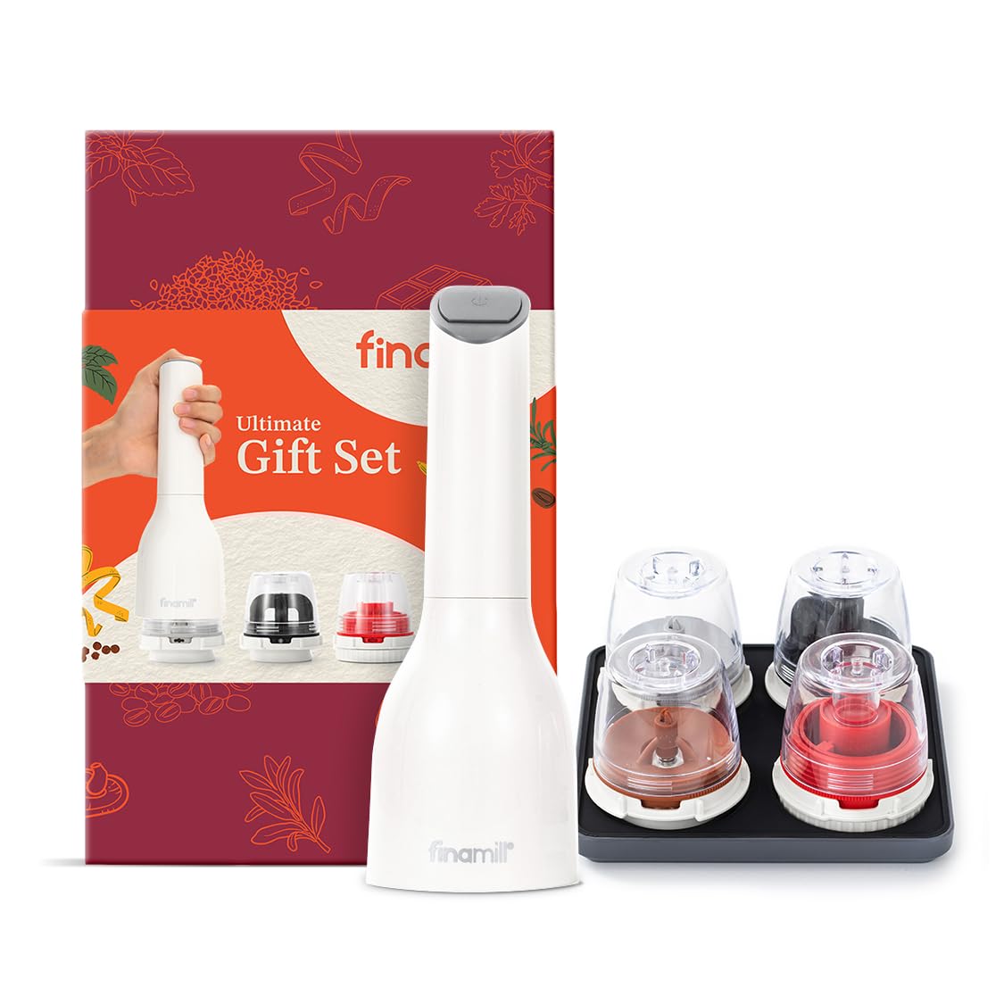 FinaMill Ultimate Gift Set – Battery Operated Spice Mill with 4 Spice Pods & Slate Quartet Stackable Tray with Adjustable Coarseness, Ceramic Grinder,