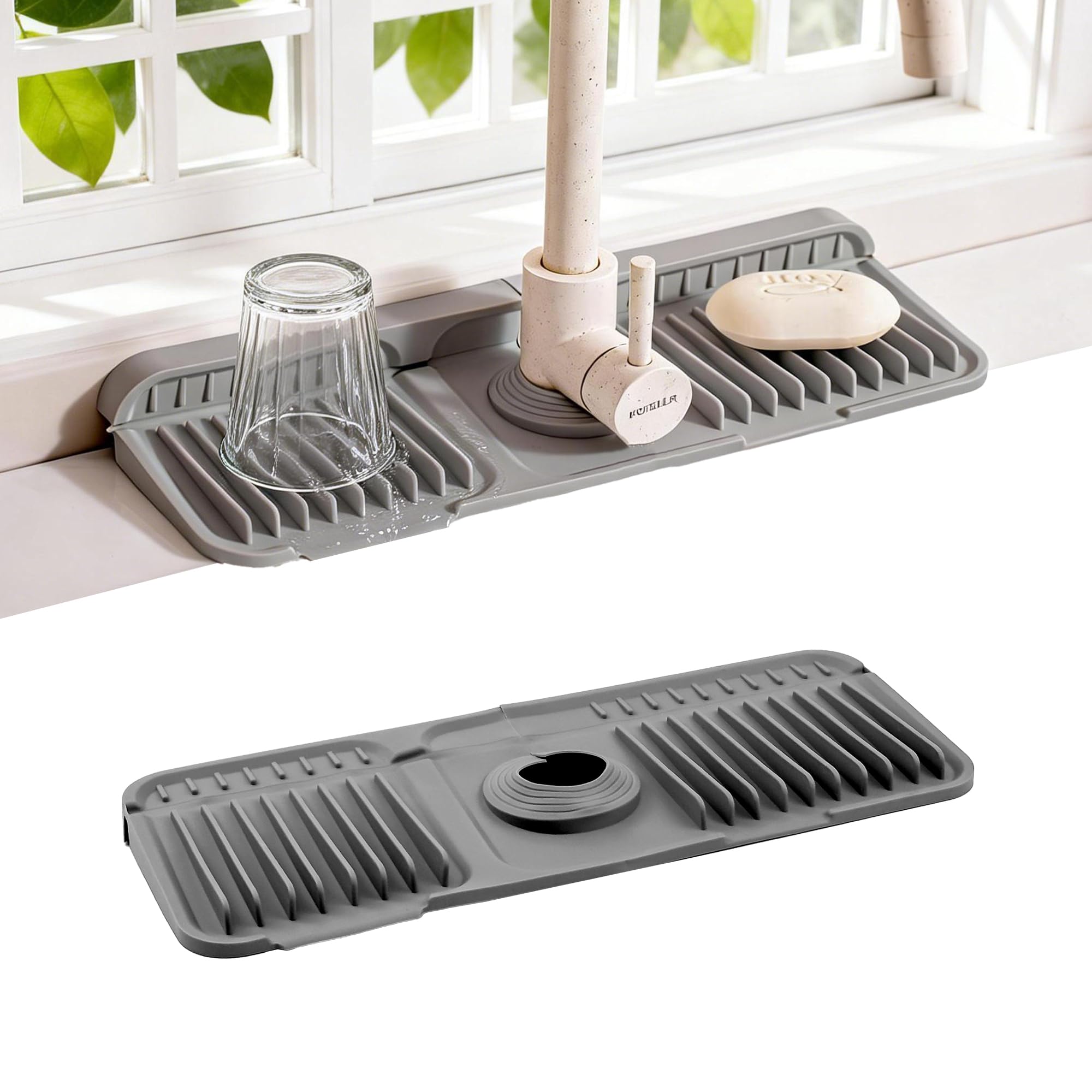 Multifunctional All-in-One Sink Faucet Mat – This premium silicone splash guard for kitchen sink integrates a built-in soap holder, sponge caddy, and draining rack. Keep your sink area organized, dry, and tidy effortlessly. Customizable Snap-On Fit for Any Faucet – Features adjustable snap-on bu