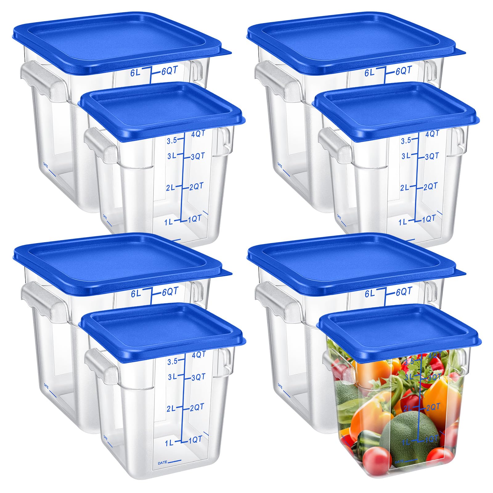Suclain 8 Pack 4 QT and 6 QT Food Storage Containers with Lids Scales Handles Square Clear Restaurant Food Storage Containers Polycarbonate Commercial