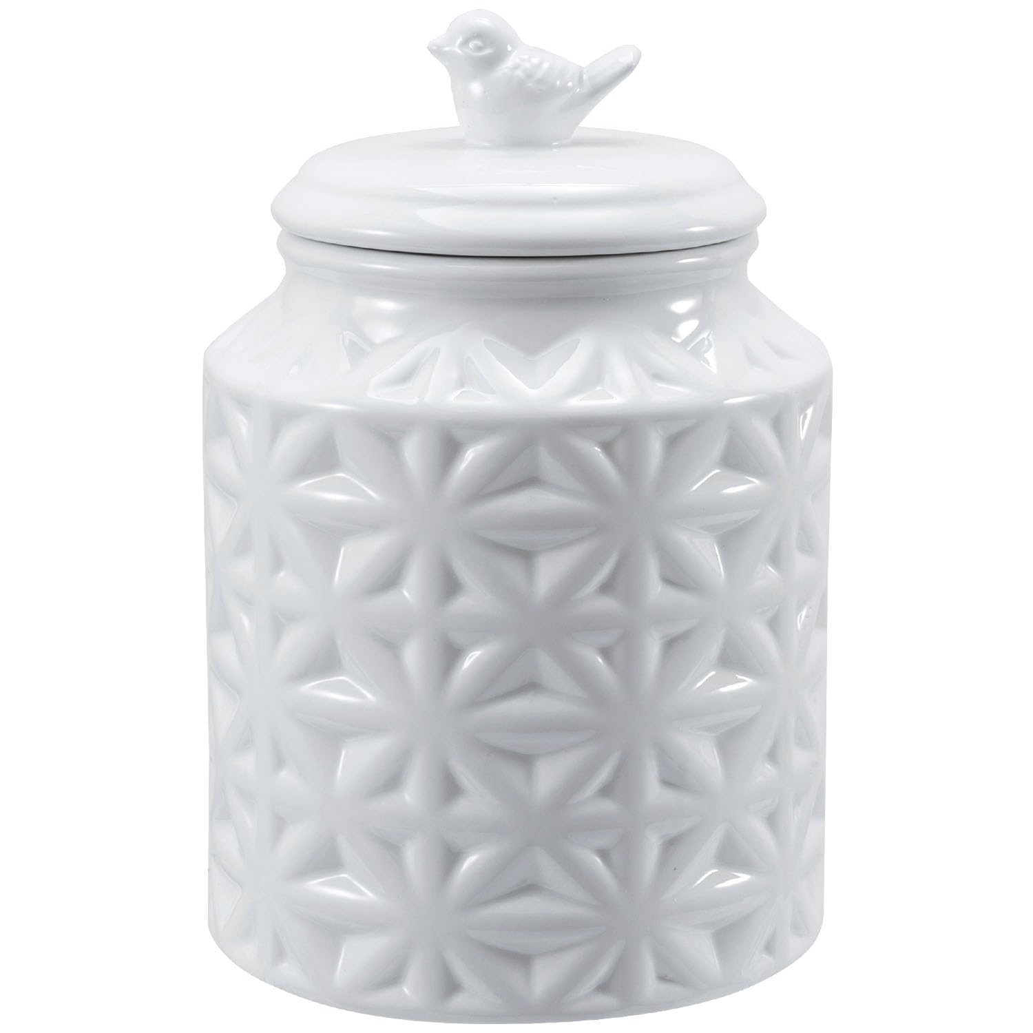 6-inch round white ceramic cookie jar adds vintage charm to any kitchen with its embossed pattern and an adorable bird perched atop the removable lid Featuring a top bird-shaped handle, the secure lid ensures a tight seal, keeping your cookies, treats, or other dry ingredients fresh and delicious Ve