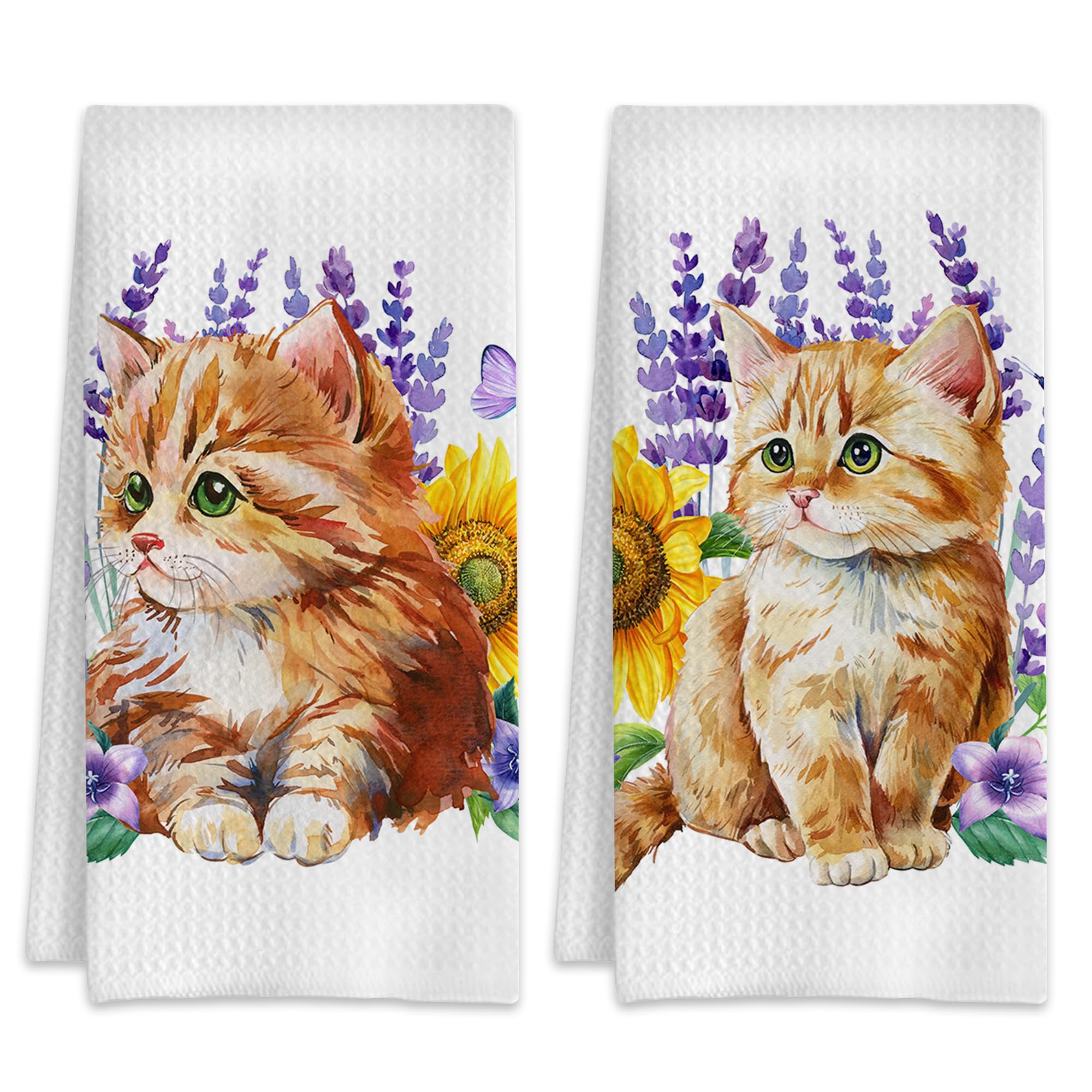 NITAHHHY Cute Kitten and Lavender Flowers Kitchen Towels Set of 2,Quick Dry Microfiber Cloth Dish Towel Sunflower Butterflies Floral Hand Towels for