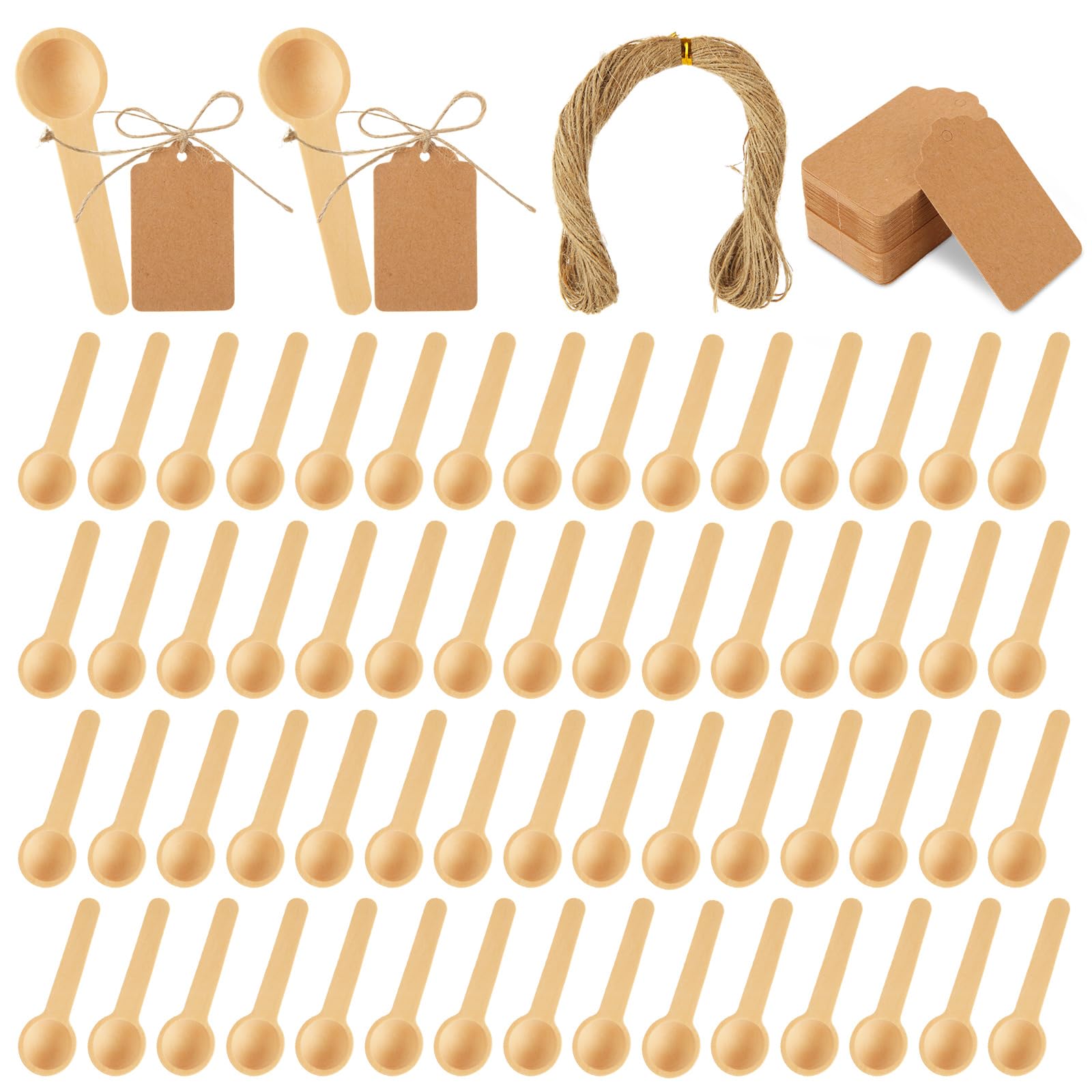 BUDGET PACKAGE: You will receive 100 mini wood spoons, 100 cowhide labels and 1 roll of rope, enough to meet your daily kitchen use needs, and these items are the perfect gift choice. Please note that jars are not included HIGH QUALITY:Mini wooden spoon is made of high-quality wood, the surface is