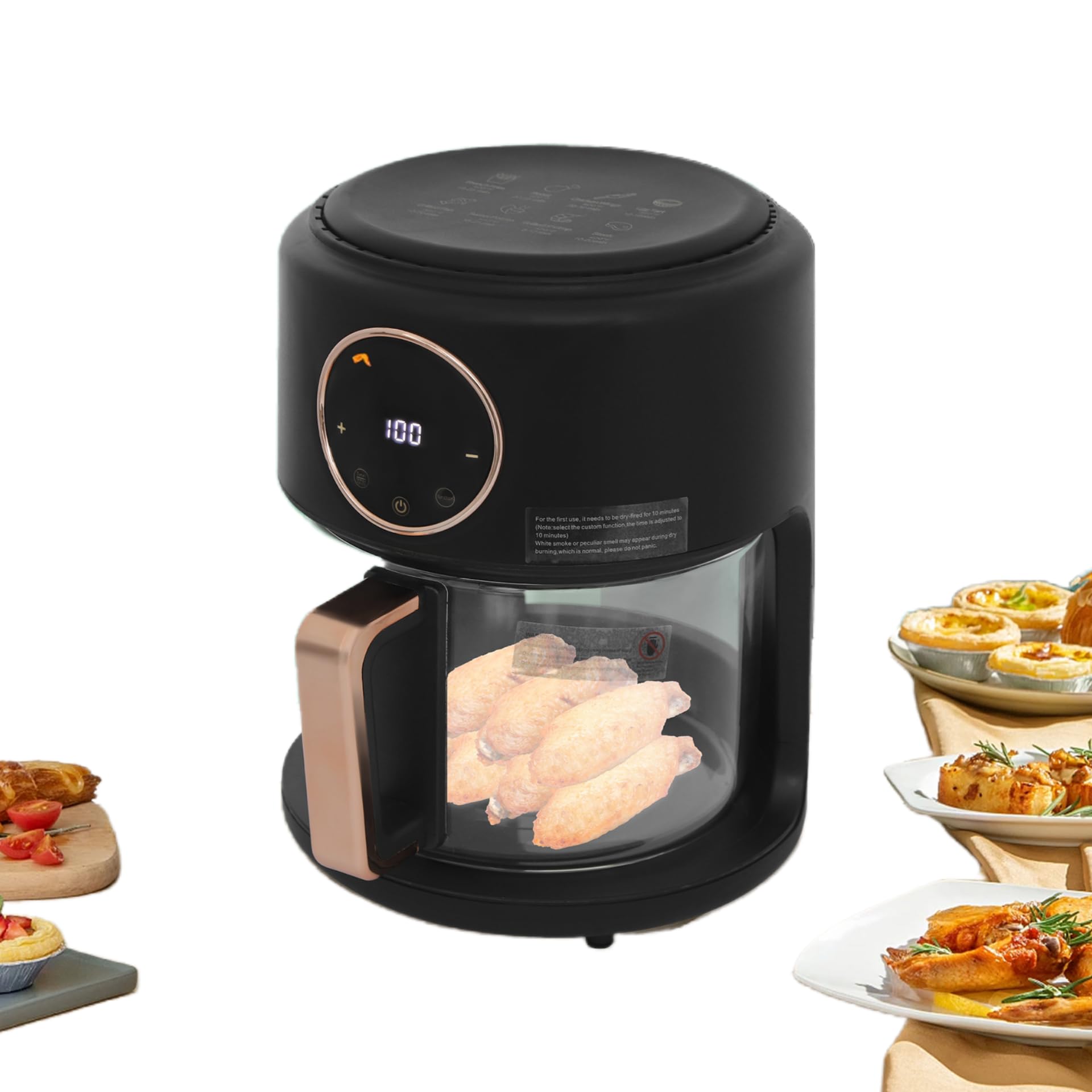 Versatile Cooking Options: Enjoy 8 preset cooking modes (French fries, roast, chicken wings, egg tarts, grilled fish, sweet potatoes, grilled shrimp, steak) with customizable temperature (176°F to 392°F) and time settings (up to 60 minutes). Whether you're preparing a quick snack or a gourmet meal