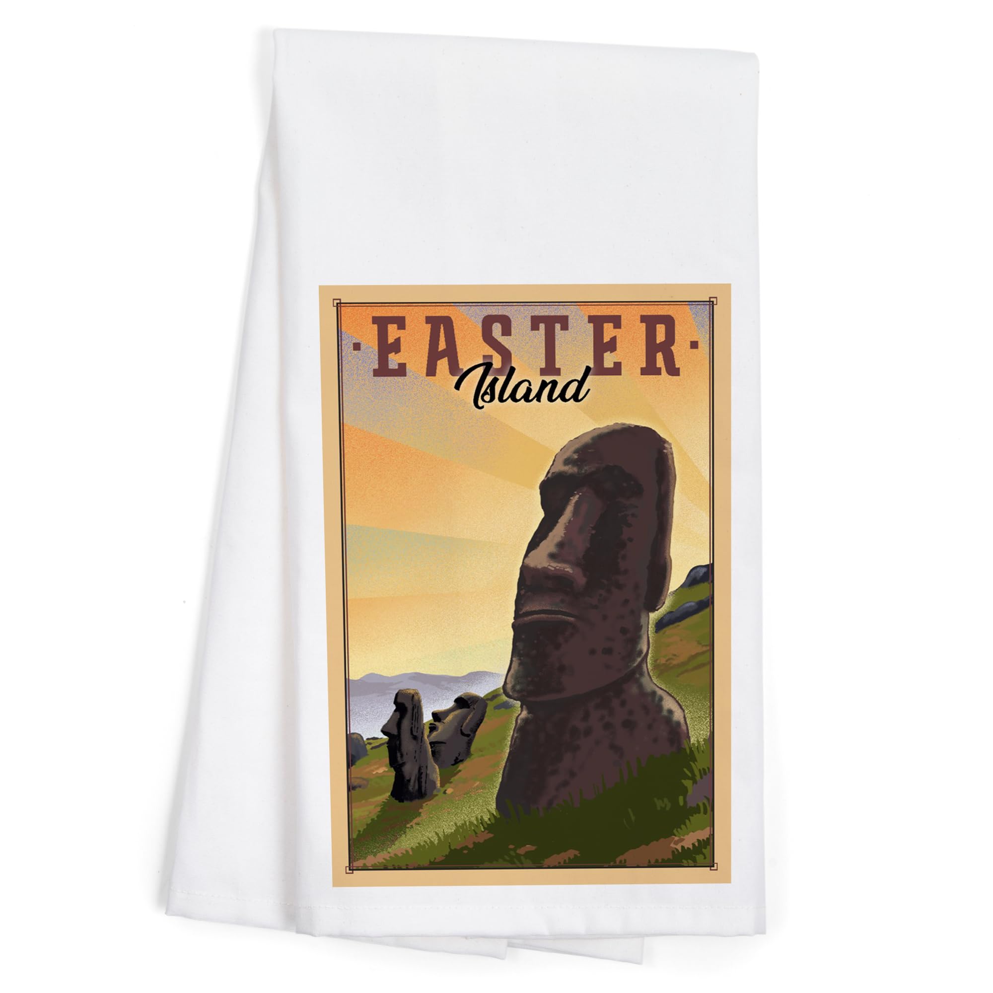 Easter Island, Lithograph (100% Cotton Tea Towel, Decorative Hand Towel, for Kitchen and Home). Measures 18 x 28 inches full size. Machine wash and tumble dry, reusable. Printed in Seattle using eco-friendly ink. High-quality kitchen tea towel from Lantern Press boasts sharp detail and vivid imagery