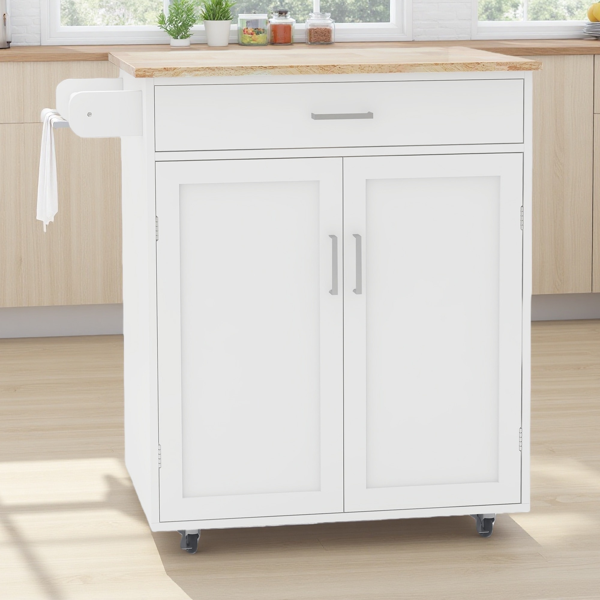 Description This rolling kitchen island offers a practical solution for additional workspace and storage.