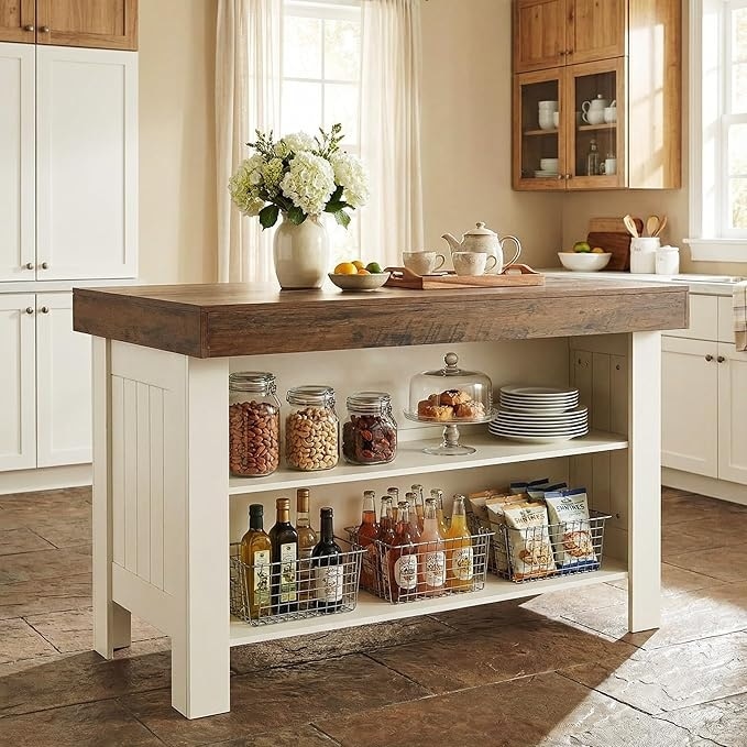Introducing the Two-Tier Kitchen Island with Storage and Power Outlet, a perfect blend of rustic farmhouse charm and functionality.