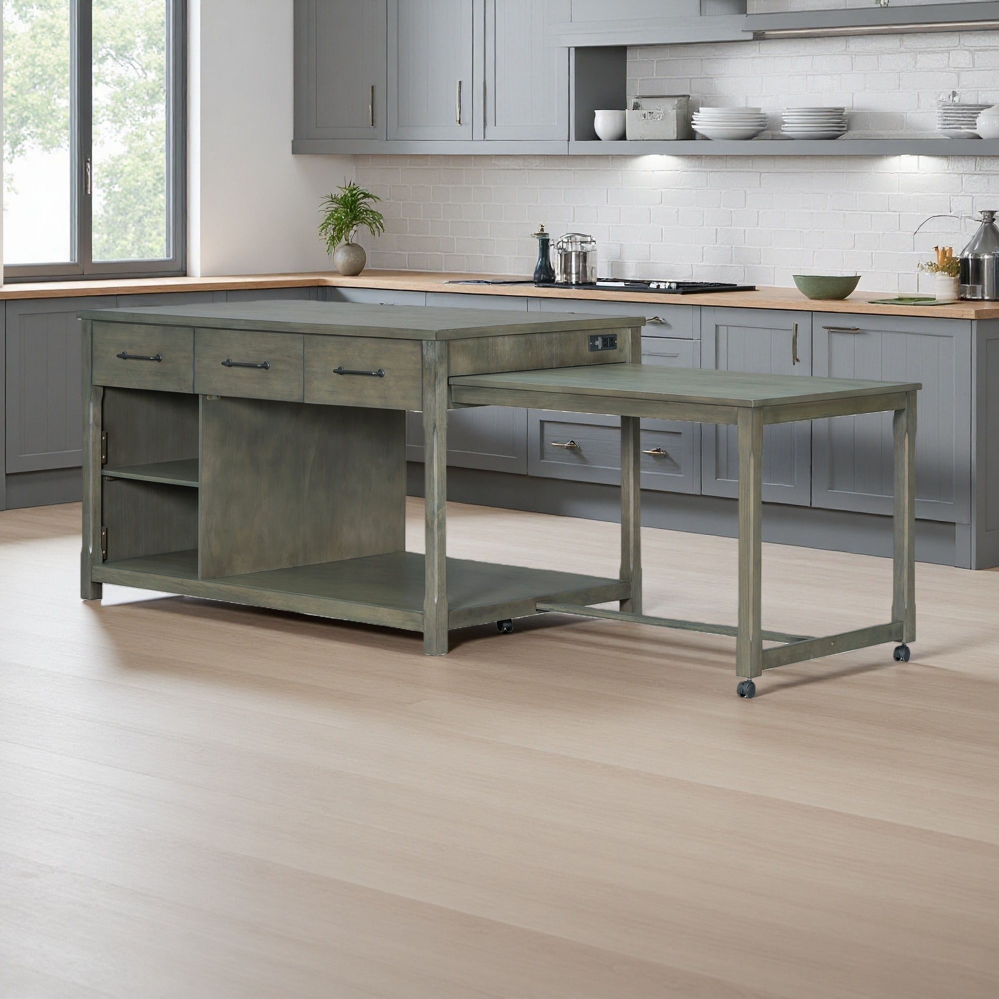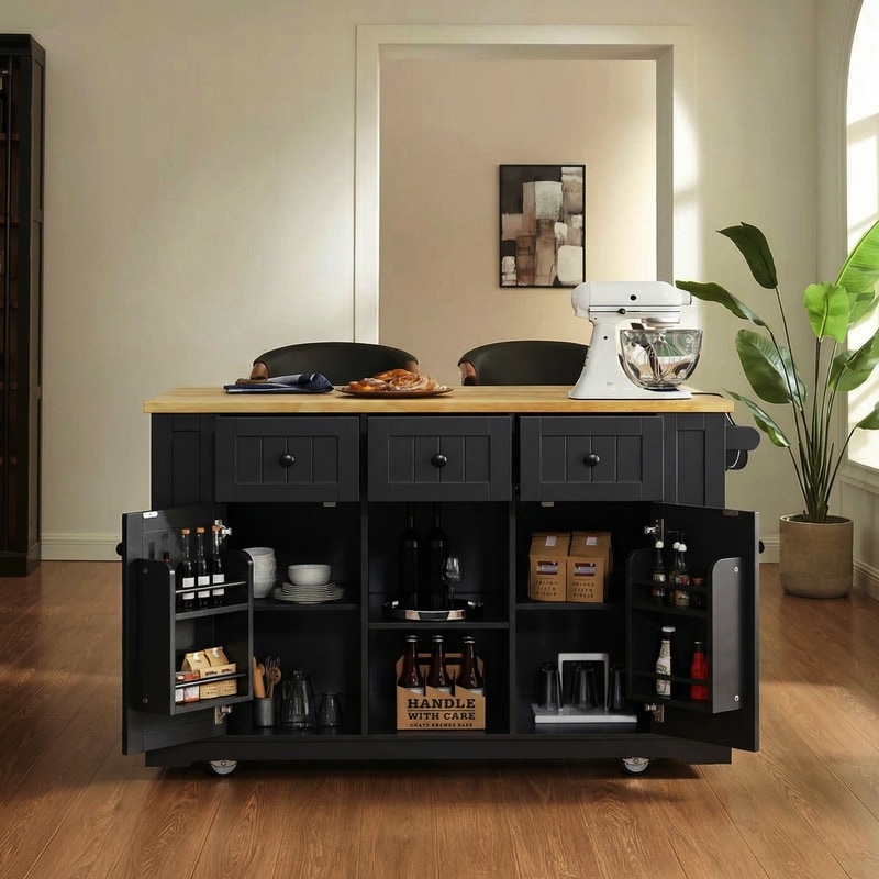 Kitchen Island with Built-In Power Outlets, Drawers & Open Shelves