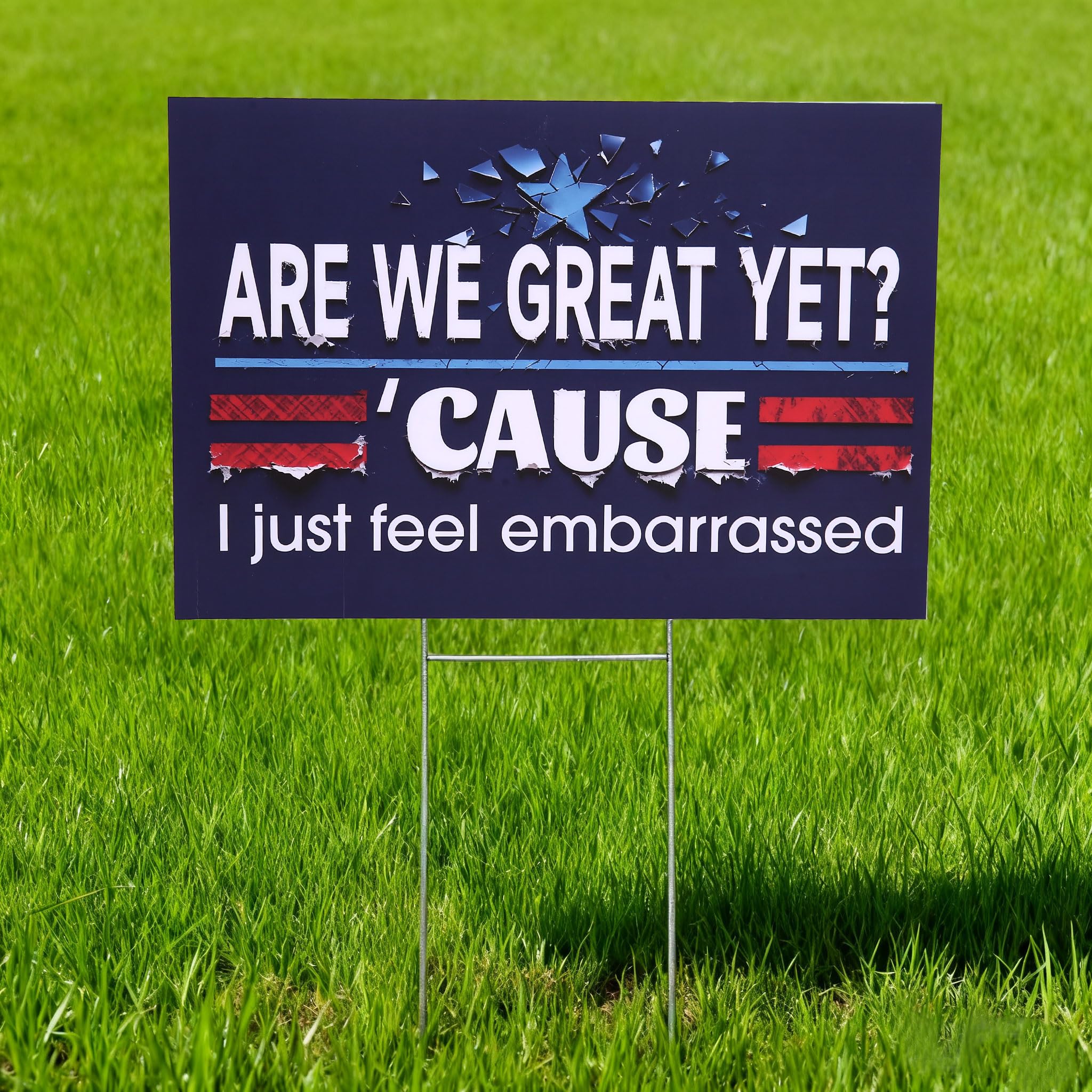 Double-Sided & All-Angle Visibility: Broadcast your powerful "Are We Great Yet? CAUSE I just feel embarrassed" message with maximum impact. Featuring vibrant, high-resolution printing on both sides, this yard sign ensures crystal-clear readability and a professional presence from every viewing angle