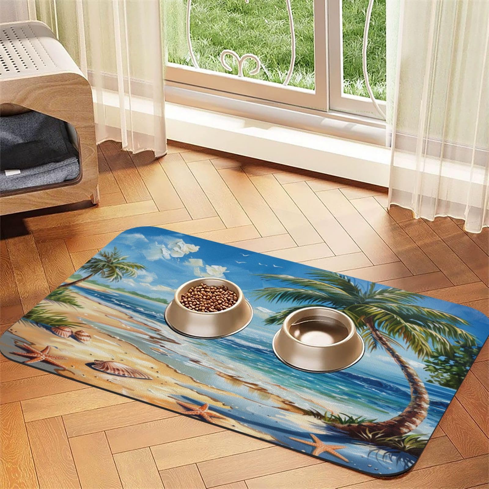 Summer Beach Palm Tree Pet Feeding Mat Absorbent Dog Food Mat for Floor Cat Dog Bowl Mats Rug Pet Placemats for Food Water Pets Supplies 16x24
