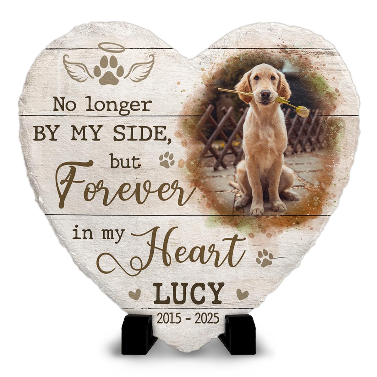 Customizable Memorial: Our heart shaped headstone marker can be personalized with your pet's name, photo and optional words of inspiration, making it a unique piece of art decoration. A memorable addition to your dog house outdoor or as a sympathy gift basket addition. Durable Material: Made from sl