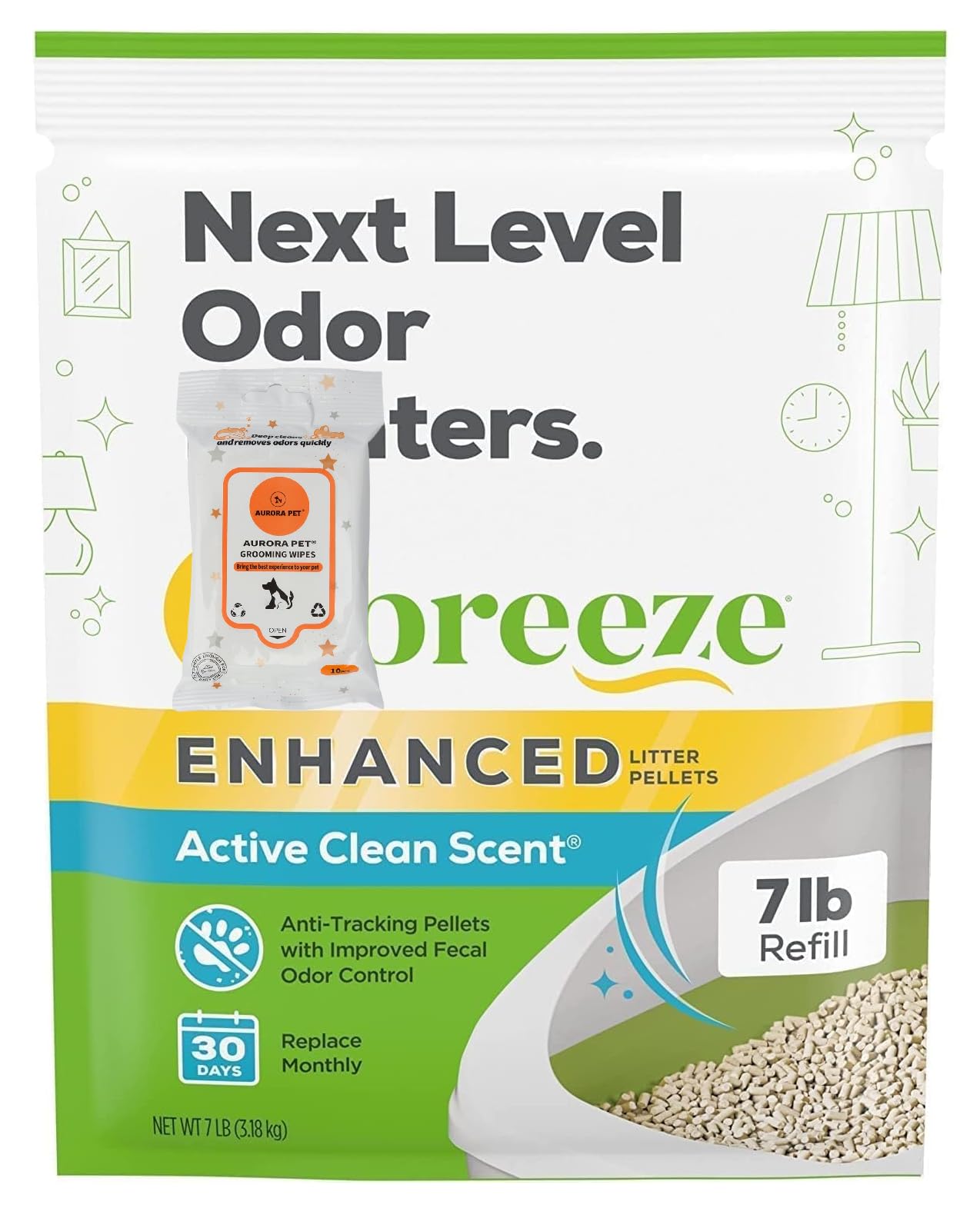Cat Breeze Enhanced Litter Pellets, Active Clean Scent, 7 lb Refill with Aurora Pet Care Wipes