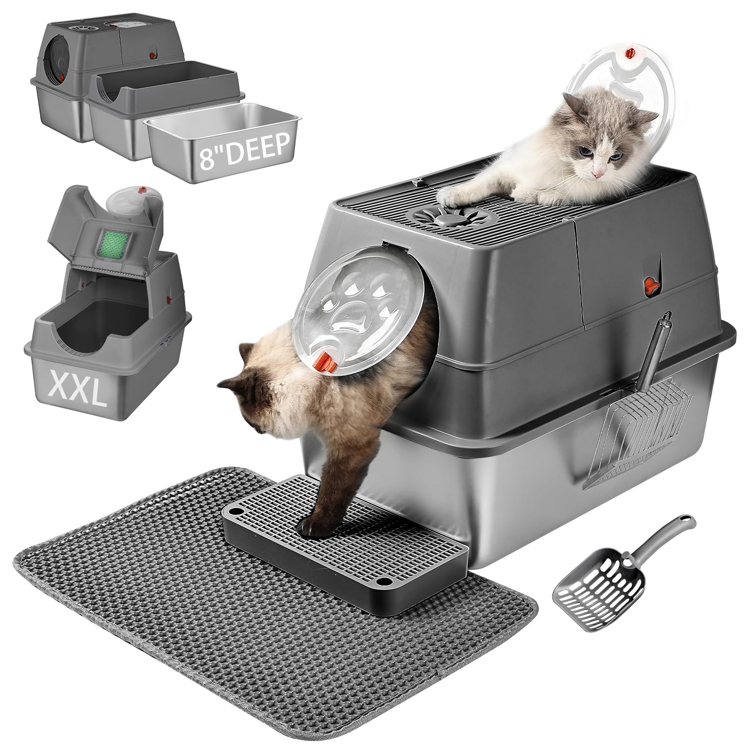 Stainless Steel Litter Box with Lid, 135° Flip-Top XL Extra Large Enclosed Metal Litter Pan with 2 Litter Scoops & Litter Mat. Easy to Clean,