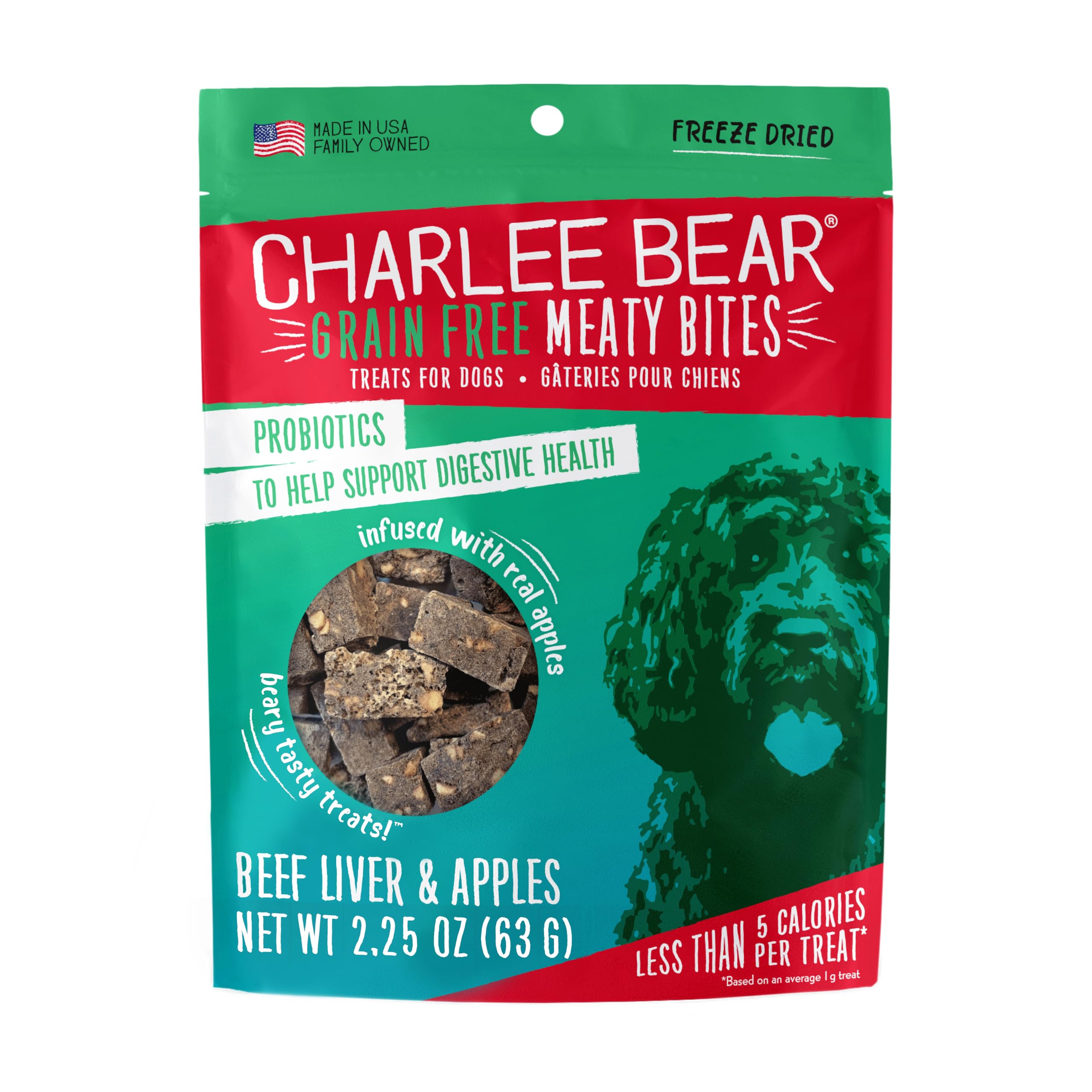 Charlee Bear Grain Free Meaty Bites Freeze Dried Dog Treats, Beef Liver and Apples, 2.25 Ounce Resealable Bag, Training Treats or Meal Topper Dogs,