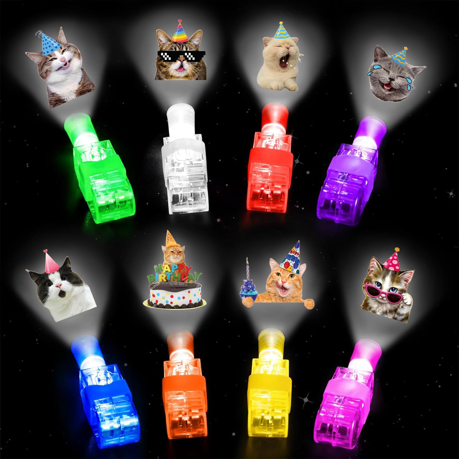 Cat Party Favors:This set contains 32pcs finger projection lights in 8 color ( 8 designs ). Each light projects a Cat theme pattern out when you press the button, turn out super cool, fun pet party favors for kids and cat party decorations Cat Theme Designs: The projected patterns are designed with