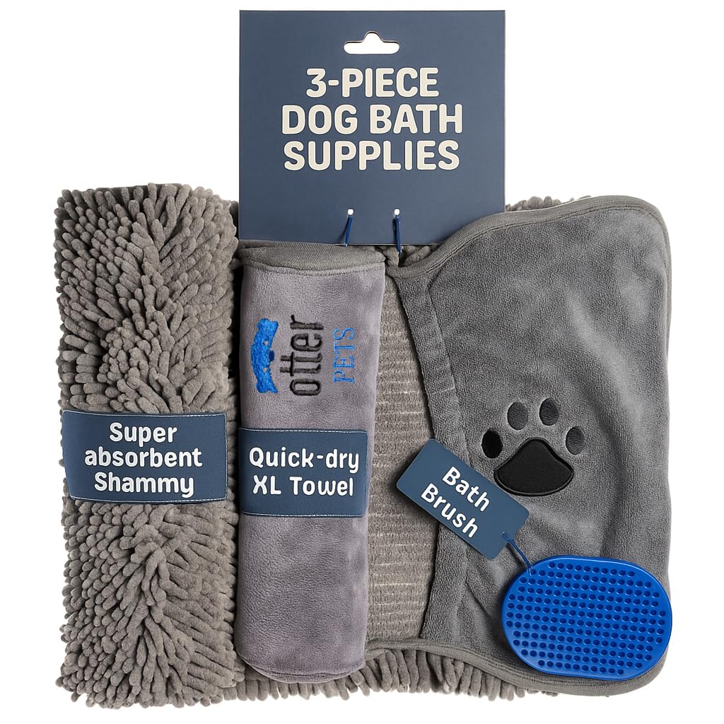 OtterPets 3 Piece Set: 2 Dog Towels and Dog Bath Brush. Dog Shammy and Microfiber Dog Towel. Super Absorbent Towels, Dog Bath Supplies, Dog Scrubber