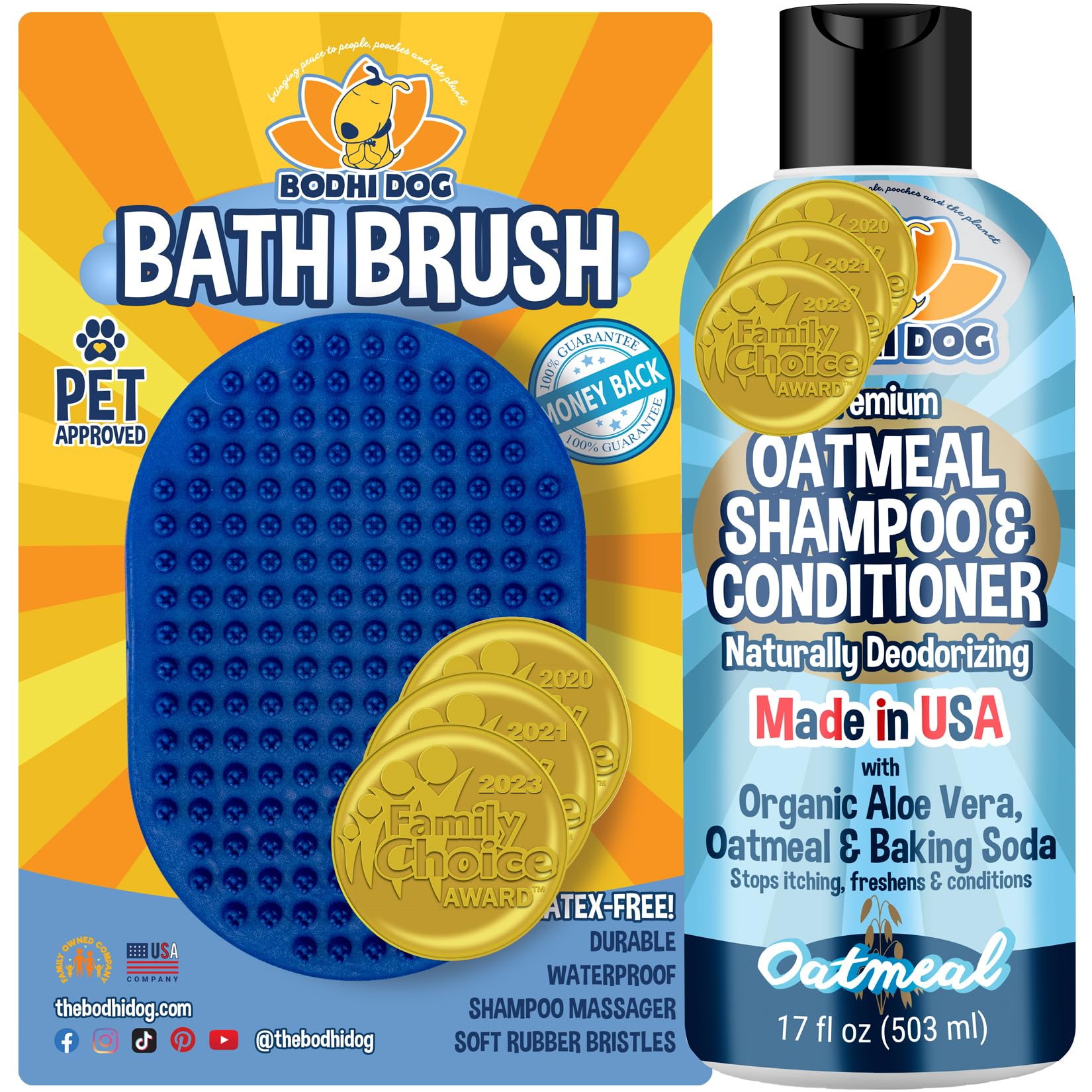 Bodhi Dog Grooming Bundle - Oatmeal Shampoo & Conditioner with Bath Brush - Pet Shower Supplies for Dogs and Cats - Gentle Care for Long, Short &