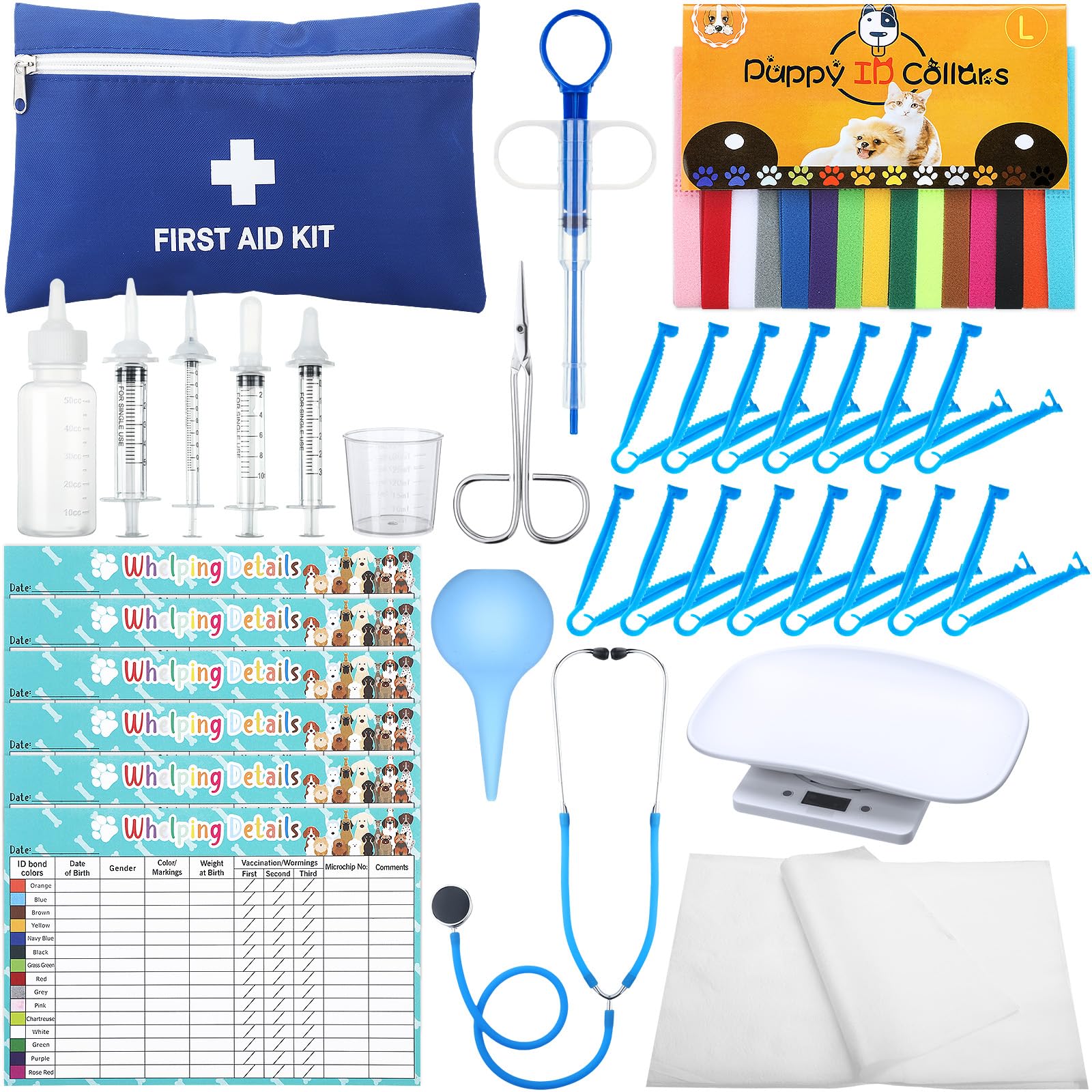 Items Your PET Needs, in One Package: this puppy whelping kit has the items for newborn puppies, with 4 puppy feeding tubes, 1 kitten baby bottle, 1 pet pill syringe, 6 record keeping charts, 15 puppy whelping collars, 1 pair of scissors, 15 umbilical cord clamps, 1 pet stethoscope, 1 bulb syringe,