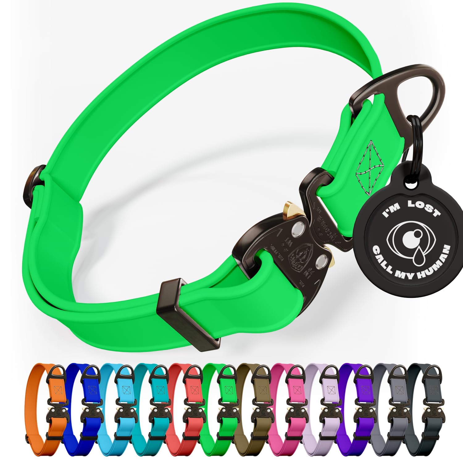 Safety: This tactical dog collar cobra buckle is the ultimate in safety. The quick release collar for dogs clip only opens when the tabs are pushed, not due to weight or stress. Durable: The biothane dog collar features a proprietary webbing coating inside and out. These dog collars for medium large