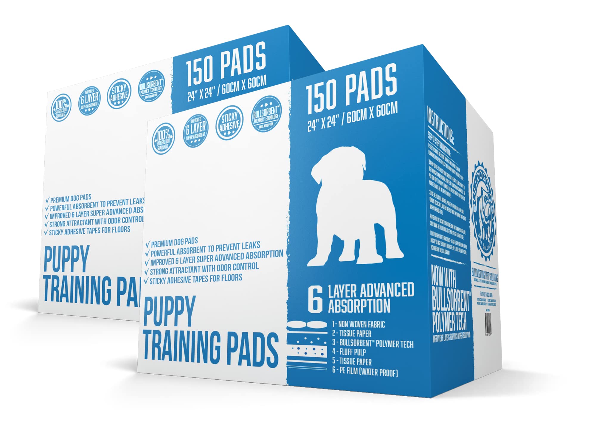 6 LAYER ABSORBENT: 300 Count Large 24x24 Puppy Pee Pads with new Bullsorbent Polymer Tech that instantly absorbs fast and turns liquid into gel, keeping floors, tiles, or carpets quickly dry ADHESIVE STICKY TAPE: Best dog training housebreaking wee wee pads that prevent moving and leaving a huge mes