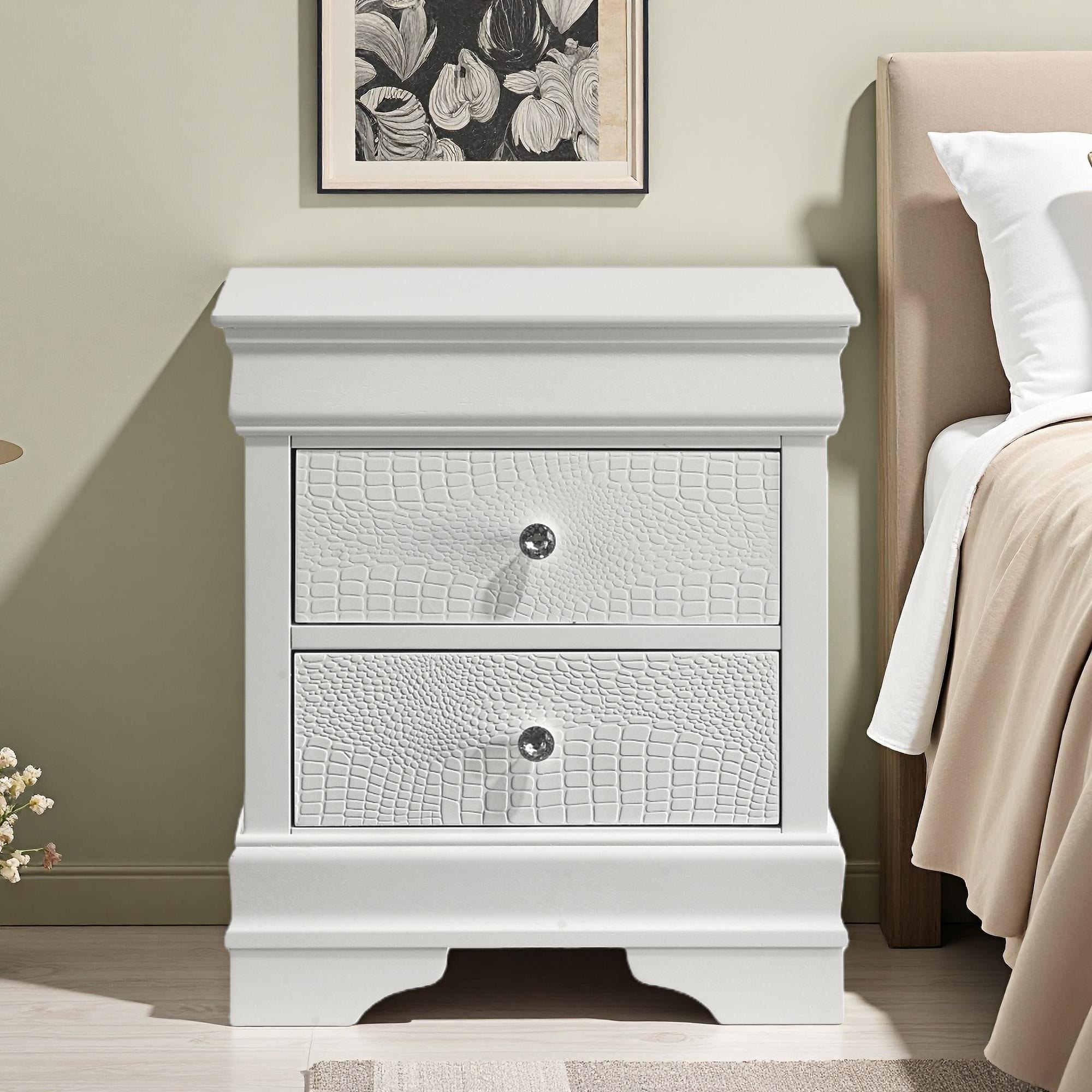 Pearl White 2-Drawer Nightstand with Diamond Star Design, Chrome Pulls, Acrylic Legs and Cord Management