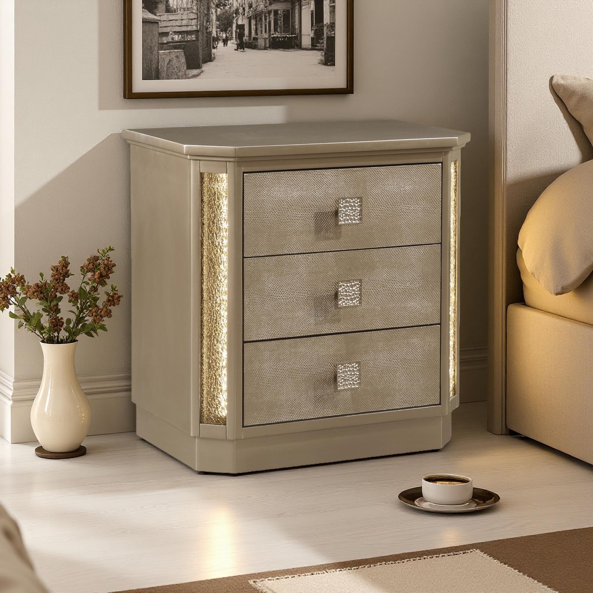 30"L Gold Finish Nightstand, 3 Drawers, LED Accent, Snake Skin Texture