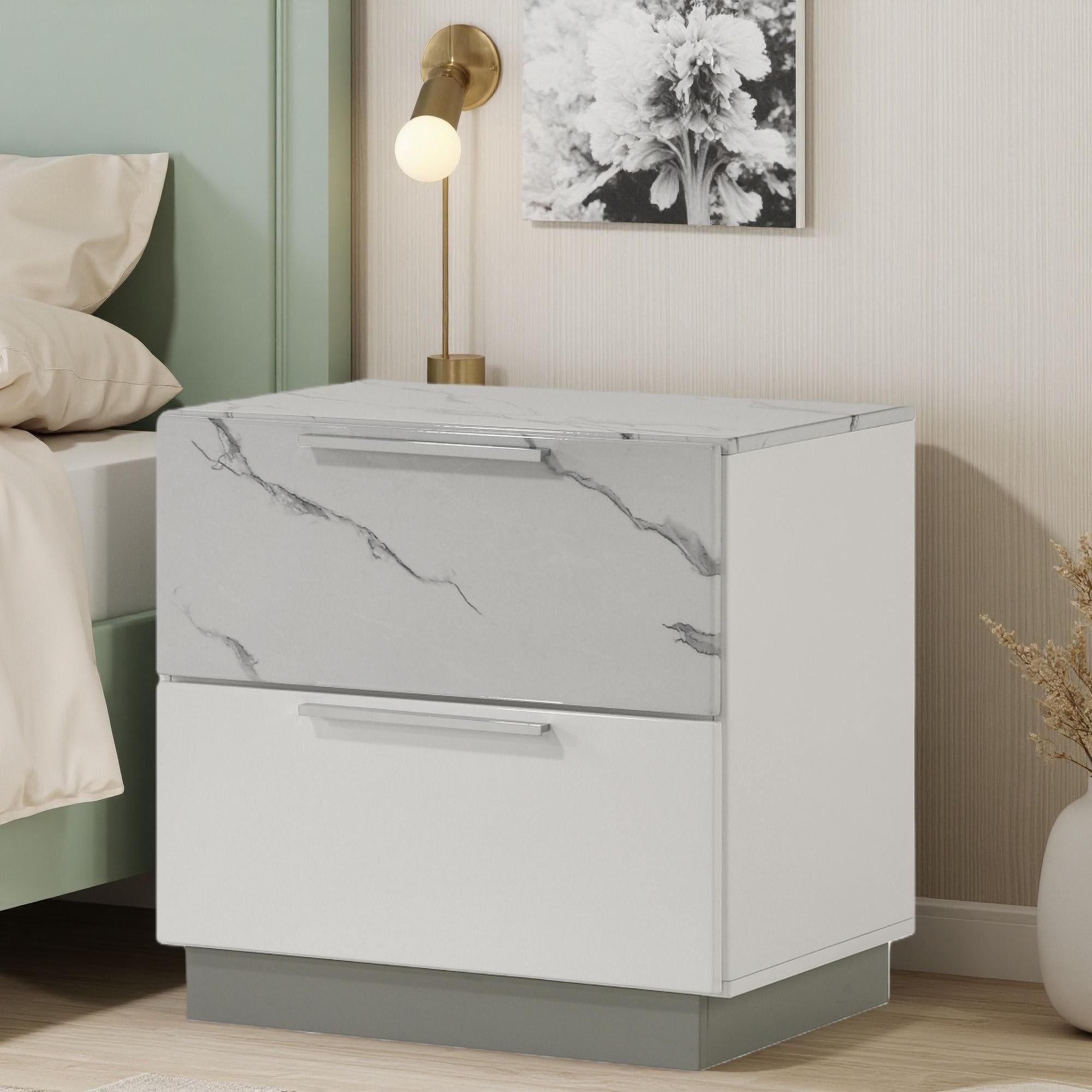 23"L Compact Two-Tone High-Gloss Marble & Lacquer Nightstand, 2 Drawers, Velvet-Lined