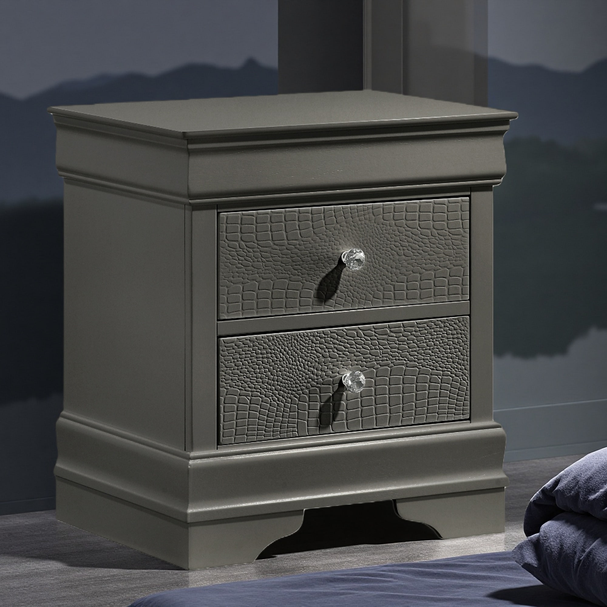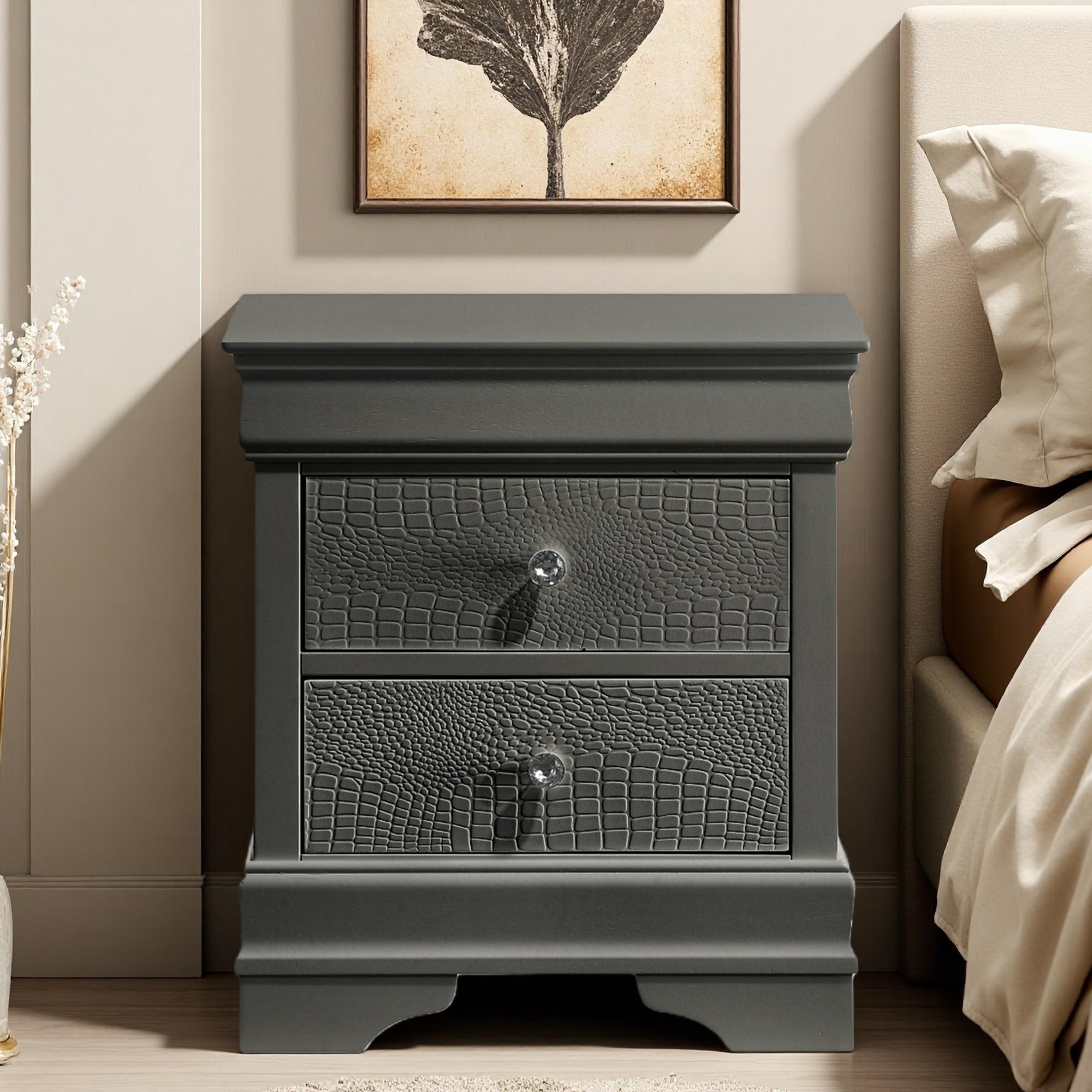 21.65"L Modern 2-Drawer Nightstand, Textured Wood Finish, Crystal-Like Knobs