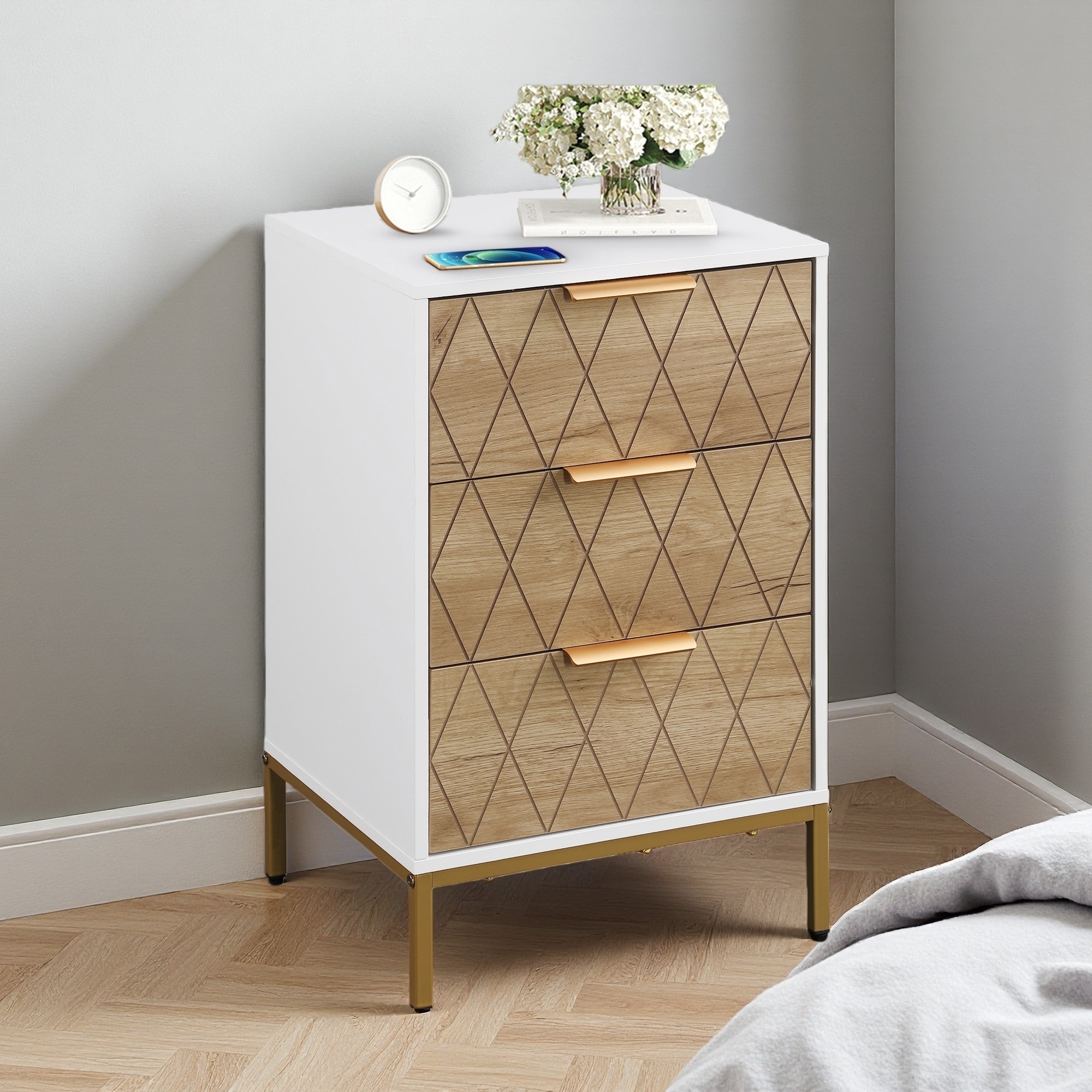15.7"L Wooden Nightstand with 3 Drawers, Mid-Century Modern, Gold Metal Feet