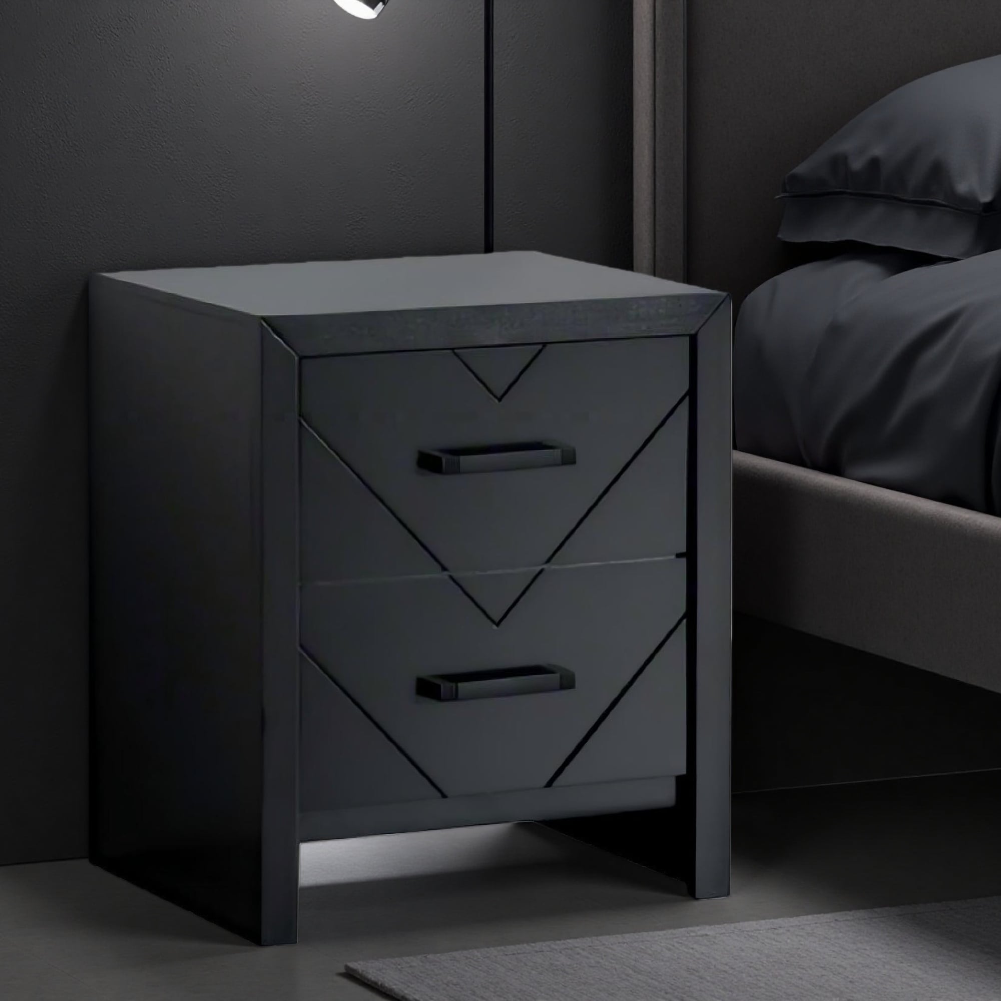 20"L Wood Nightstand, 2 Dovetail Drawers, V-Shape Embossed Fronts, Black Handles