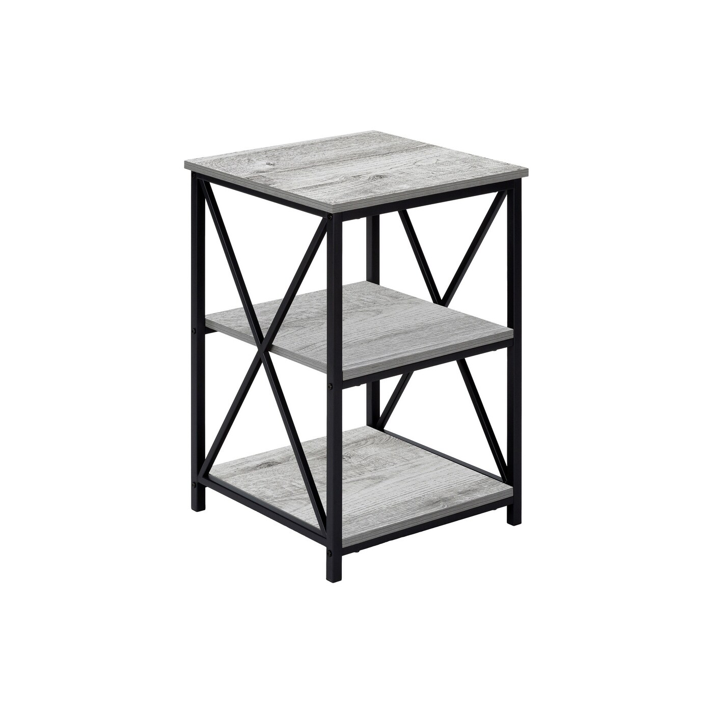 3-tier accent table featuring a square tabletop and 2 storage shelves in a black marble-look finish Slender yet sturdy black metal base has an X-shaped design on the sides for a decorative touch Finished on all sides for versatile use in a living room or…