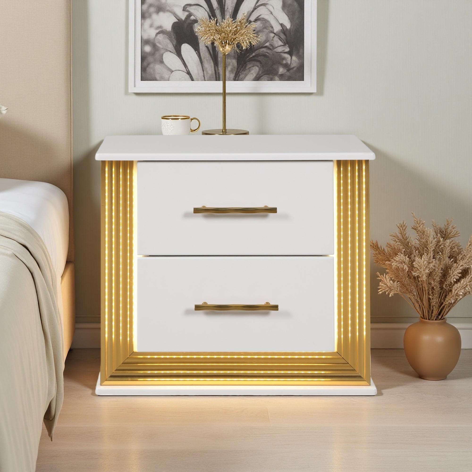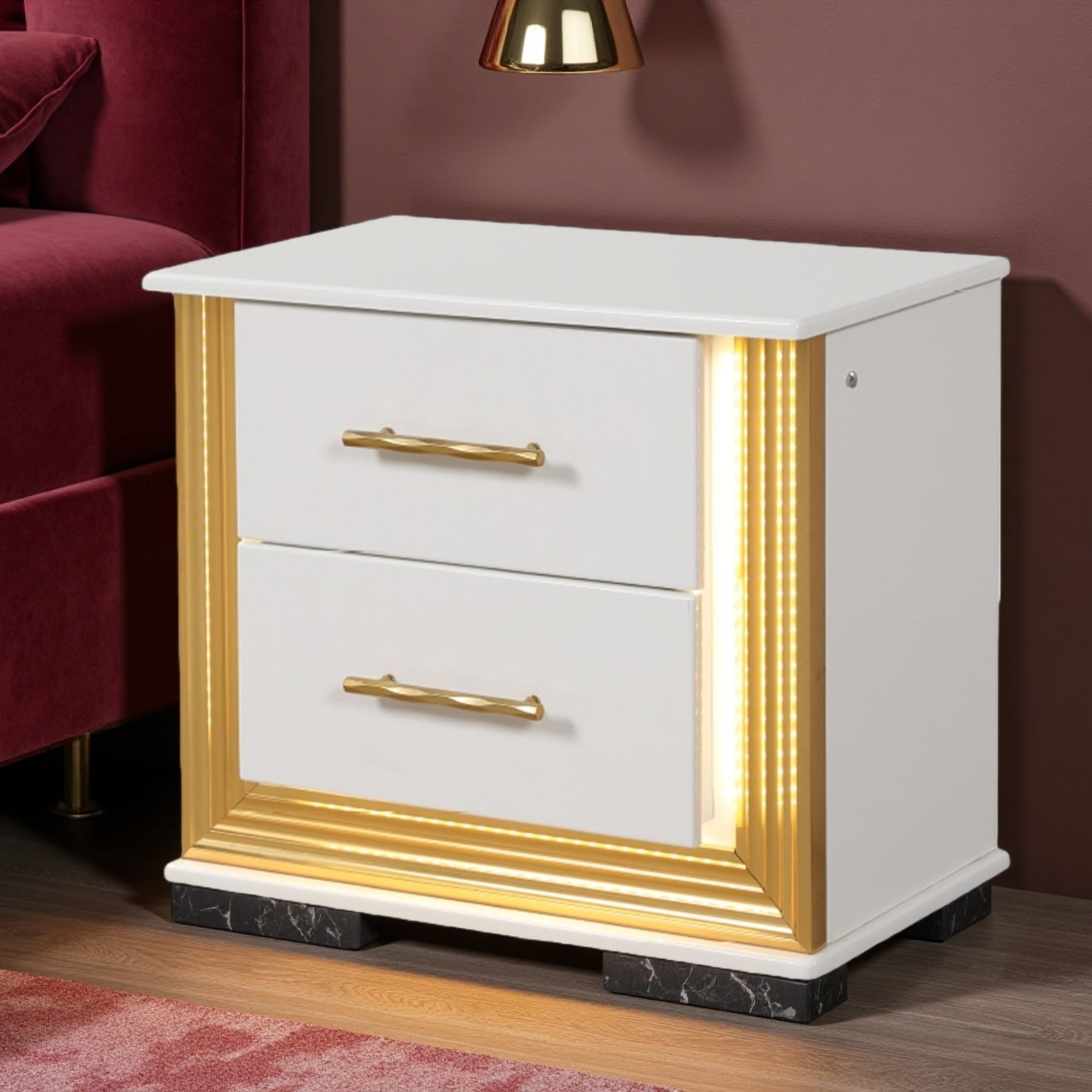 27"L Obsession Contemporary 2-Drawer Nightstand, Wood & Gold Finish, LED Luxury