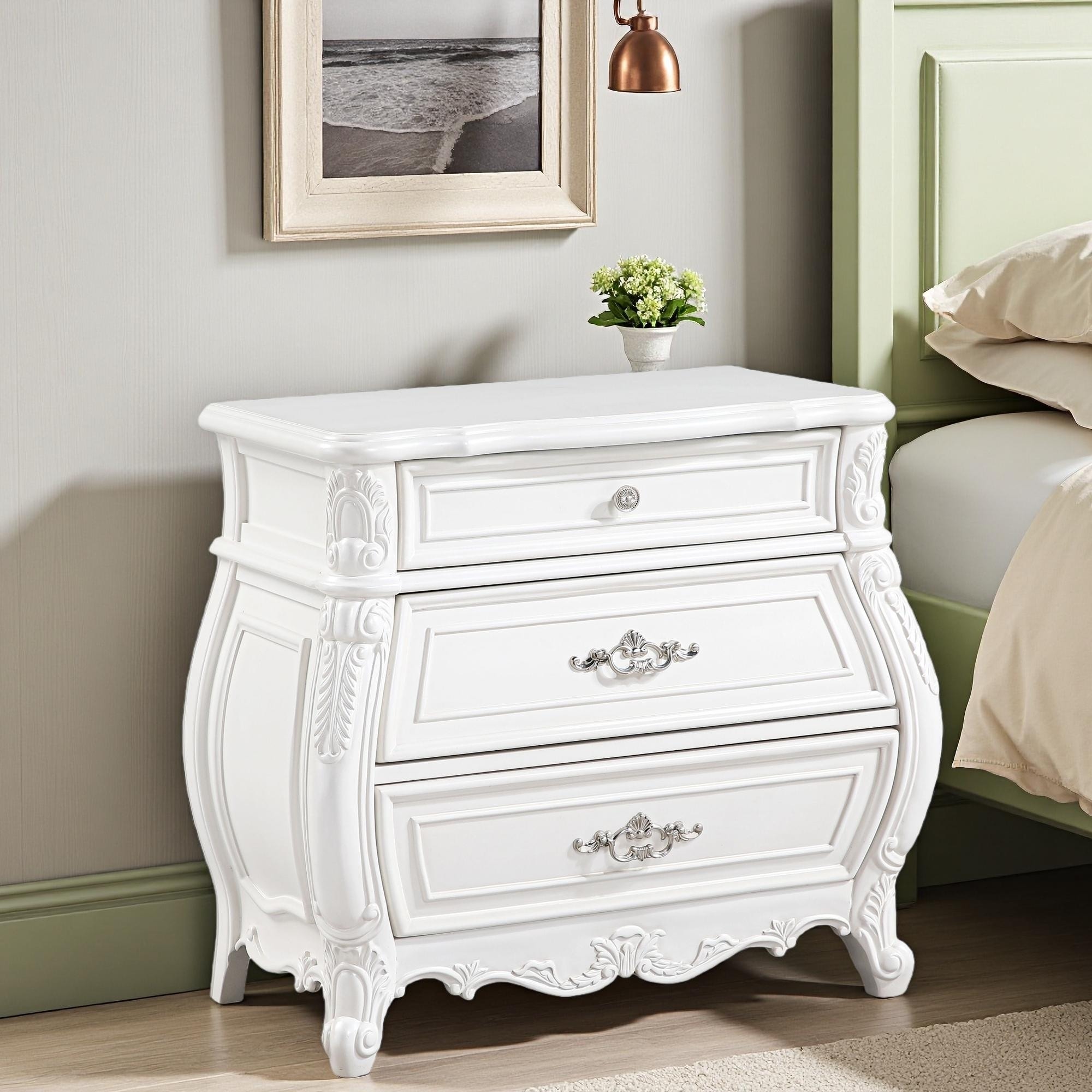 31.5"L Wood Nightstand, 3 Drawers, Pearl Finish, Intricate Carvings, Modern Style