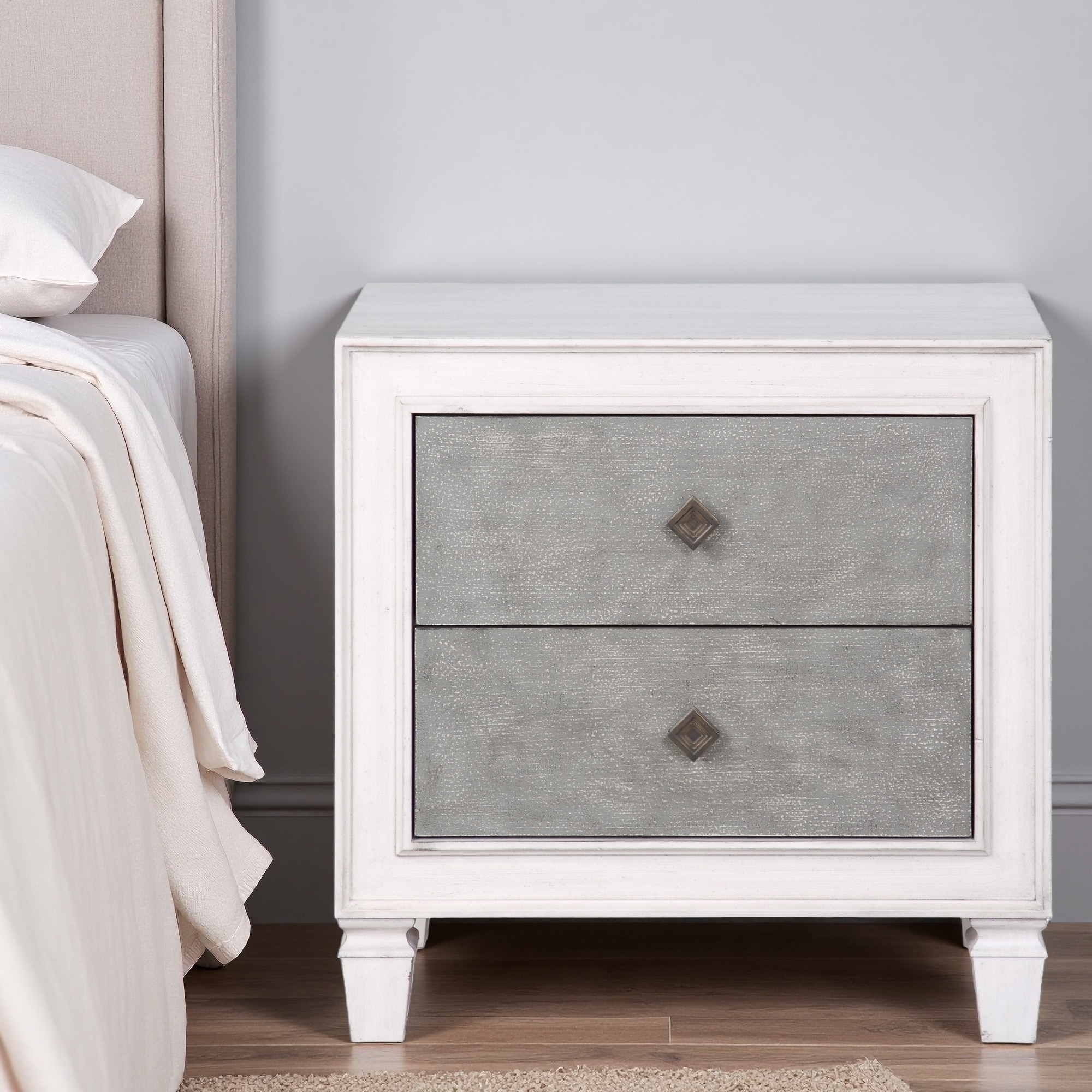 This modern rustic nightstand adds warm farmhouse charm to your bedroom with its weathered white and rustic gray finish. Crafted from durable wood, it offers both style and everyday functionality.