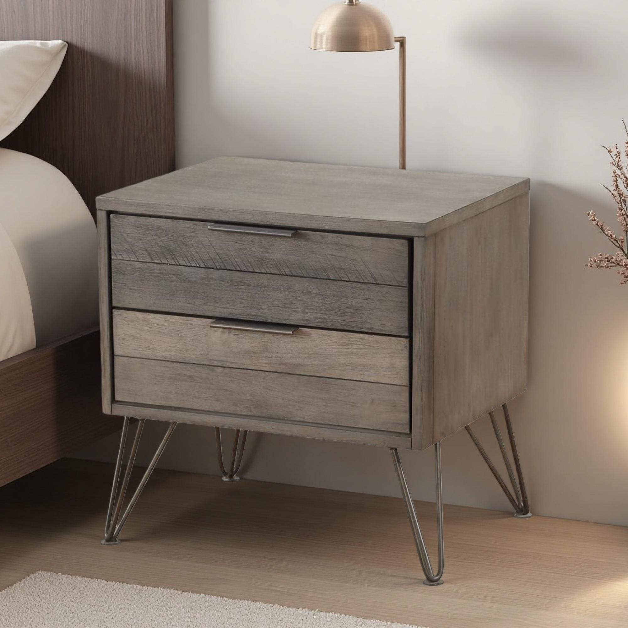 23.75"L Contemporary Solid Wood Nightstand with Metal Hairpin Legs, 2 Drawers, and Metal Handles