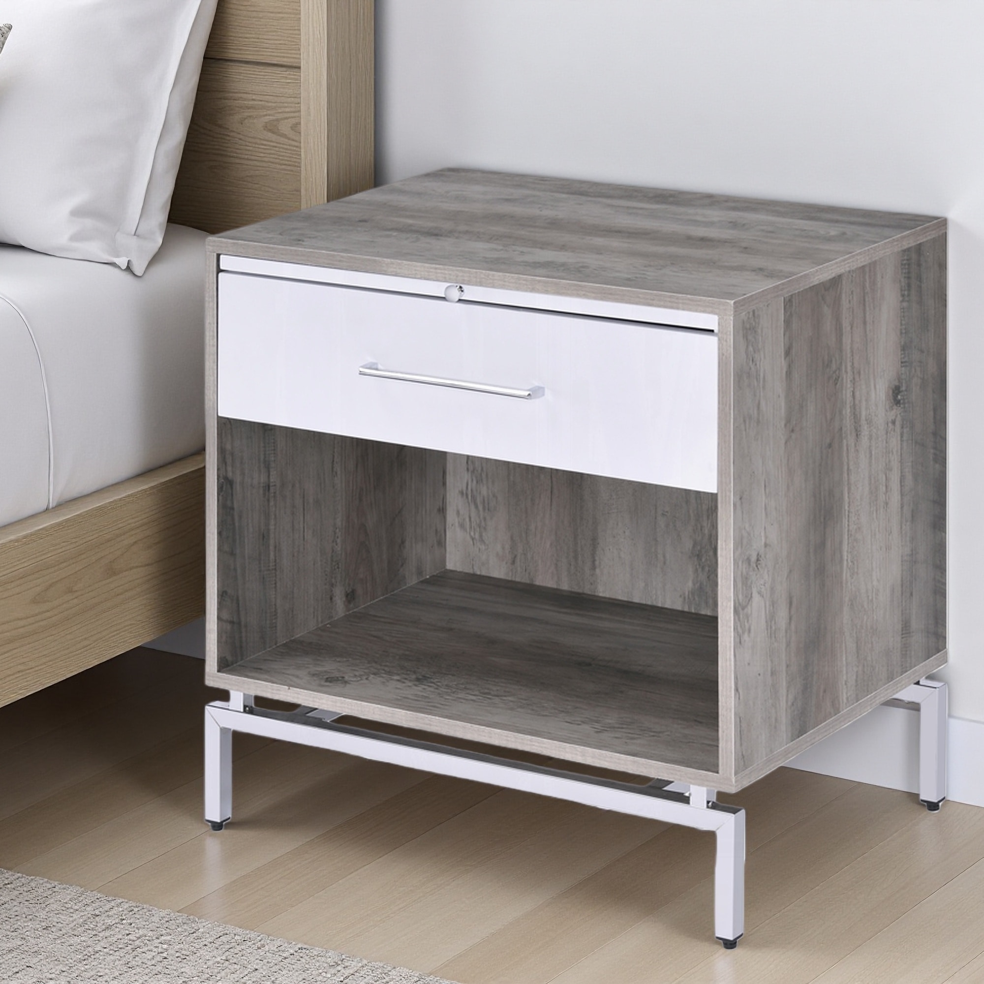 Add functional style to your bedroom with this versatile nightstand featuring a weathered gray oak and white finish for a modern, clean look.