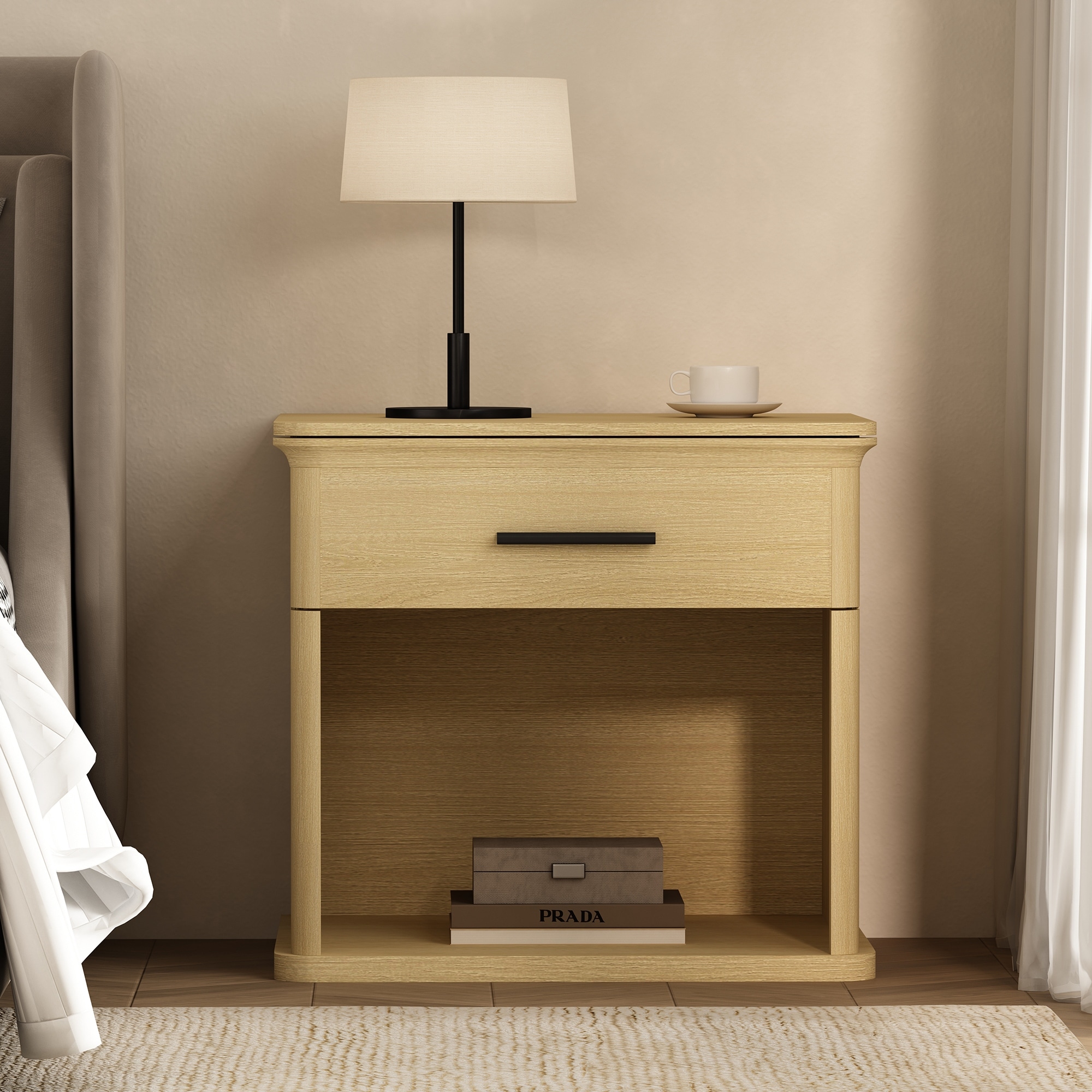 Solid Oak with Artisan Rattan: Crafted from premium North American FAS-grade red oak and paired with a handwoven rattan drawer face from Indonesia, this bedside cabinet brings together durability and organic elegance.