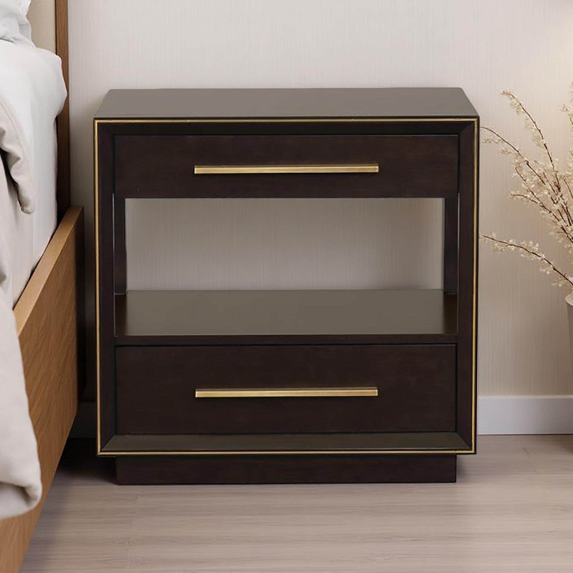 30"L Poplar & Asian Hardwood Nightstand with 2 Drawers, Shelf, Gold Hardware & USB Ports