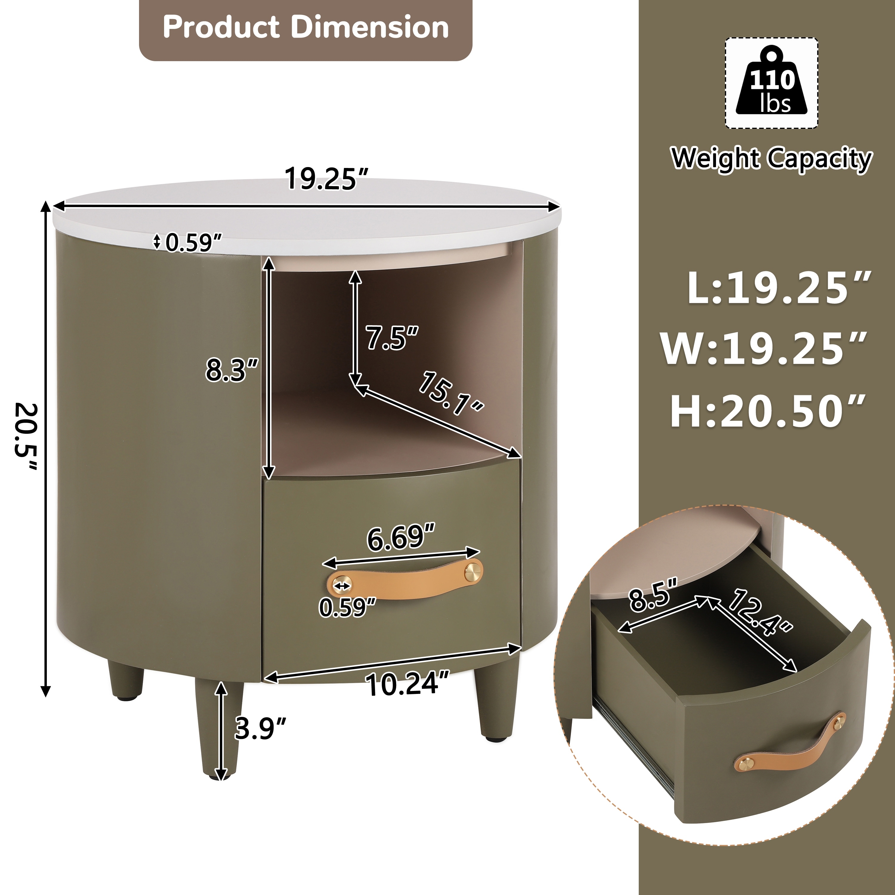 Elegant Design: Elevate your space with our compact round bedside table, featuring a sleek silhouette and rounded corners. Choose from sophisticated color options like deep blue with orange , khaki with black or olive green with light brown.