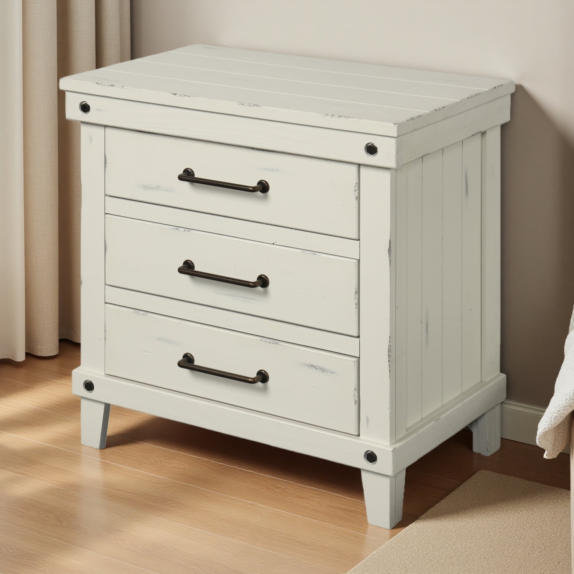 28"L 3-Drawer Nightstand, Birch Veneer & Pine Solids, Medium Distressing, Brass Hardware