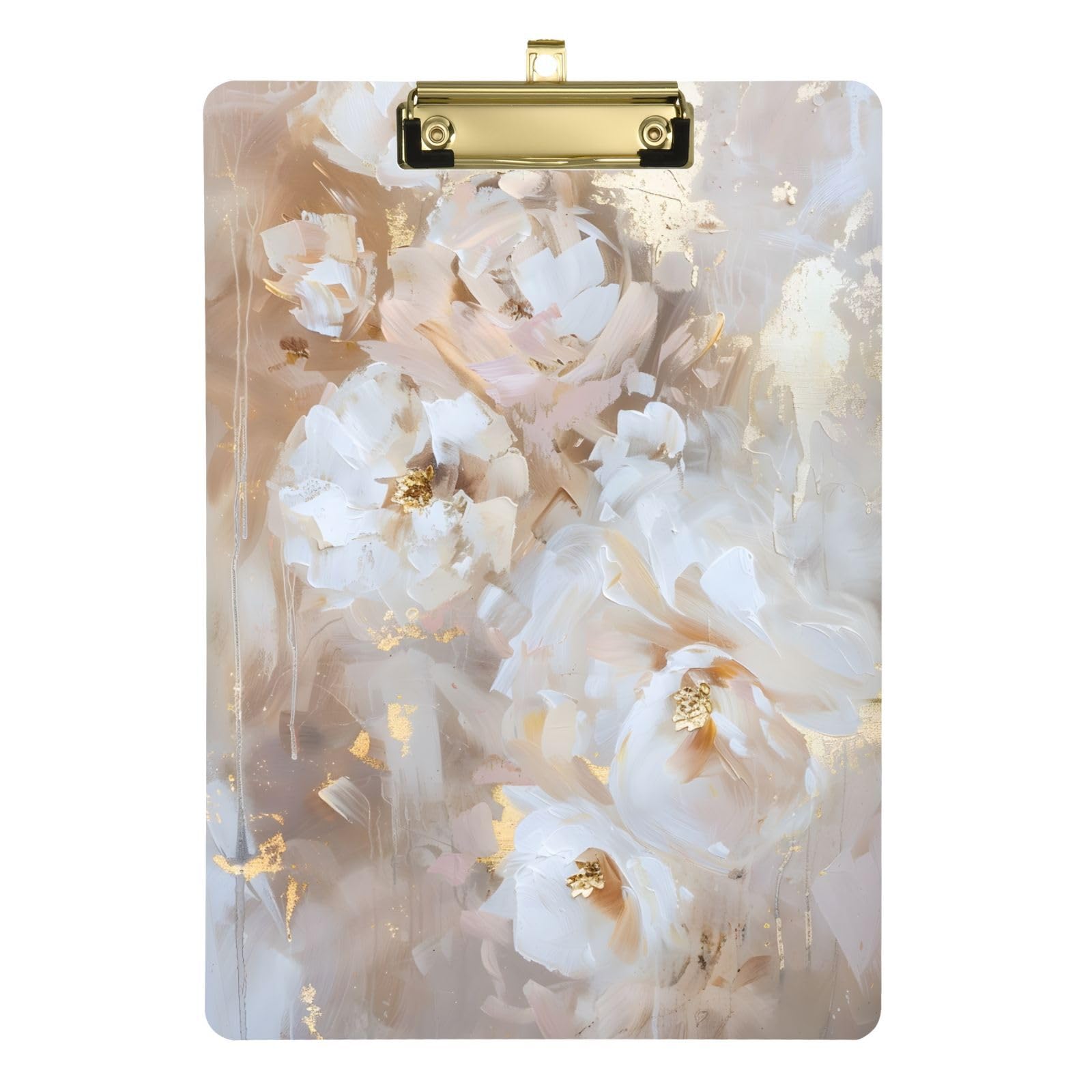 White Beige Flowers Gold Leaf Clipboard Decorative Clip Board with Metal Clip for A4 Size 9 x 12.5 in Office School Supplies, Plastic Acrylic