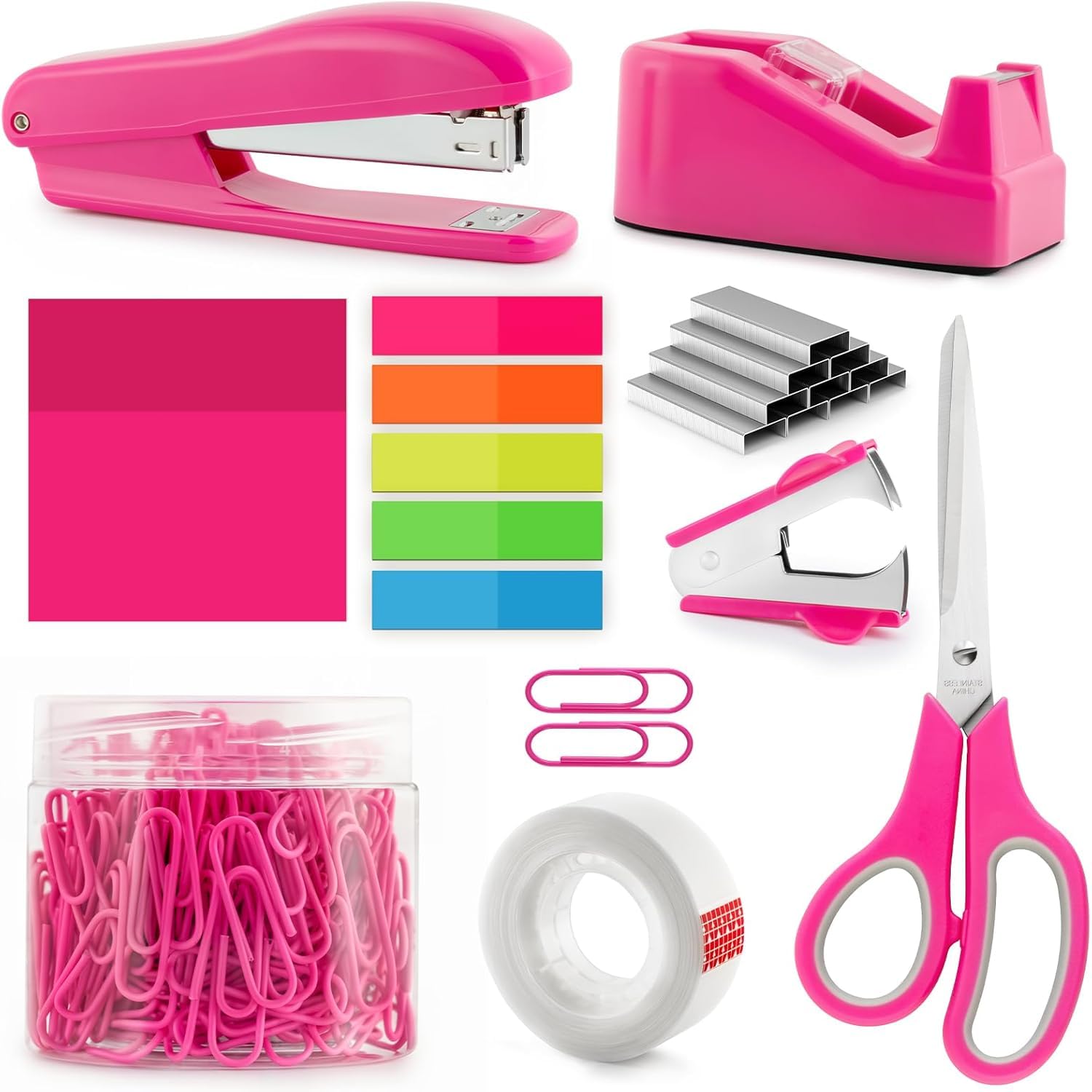 You Will Get, This hot pink office supplies set contains 1x hot pink stapler, 1x hot pink staple remover, 750x Staples, 1x hot pink tape dispenser, 1x hot tape, 1x hot pink office scissor, 100 x paper clips, 5 colors waterproof sticky tabs ,1x pink waterproof transparent sticky notes. Wide Applicati